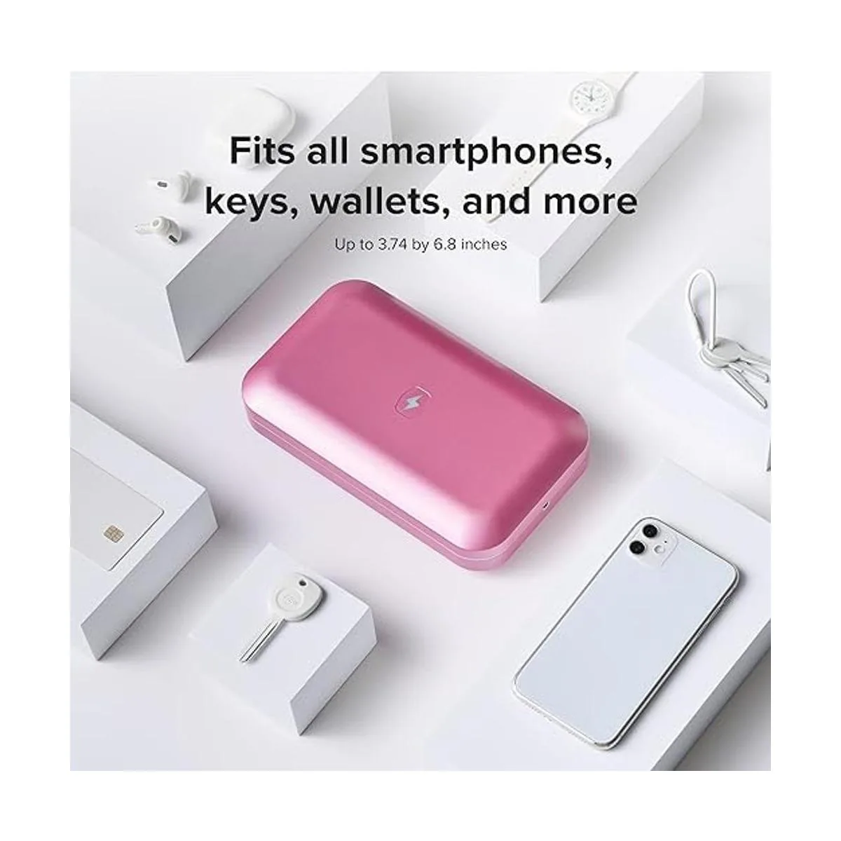 Limpiar lo que se ajusta. Si bien hemos construido PhoneSoap 3 en torno a la desinfección de los teléfonos, puede desinfectar lo que quepa en su interior. Desde chupetes, relojes inteligentes y auriculares hasta tarjetas de crédito y llaves.