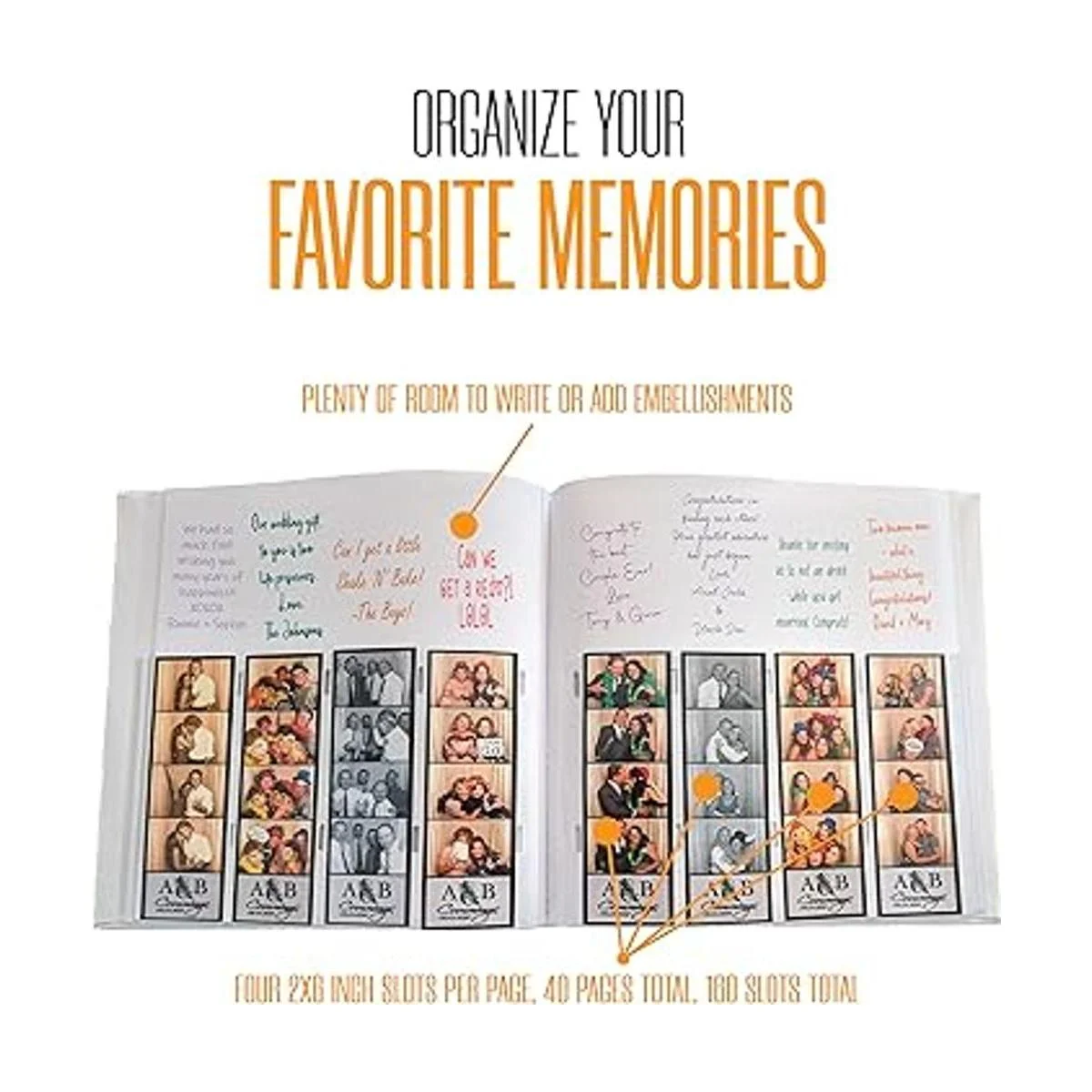 Mantén una ficha para cada ocasión: nuestro diario fotográfico de 10 x 10 pulgadas viene con 4 ranuras en cada una de las 40 páginas, por lo que puedes colocar 160 tiras de fotos y un montón de espacio para escribir o añadir adornos por encima de las ranuras de fotos.