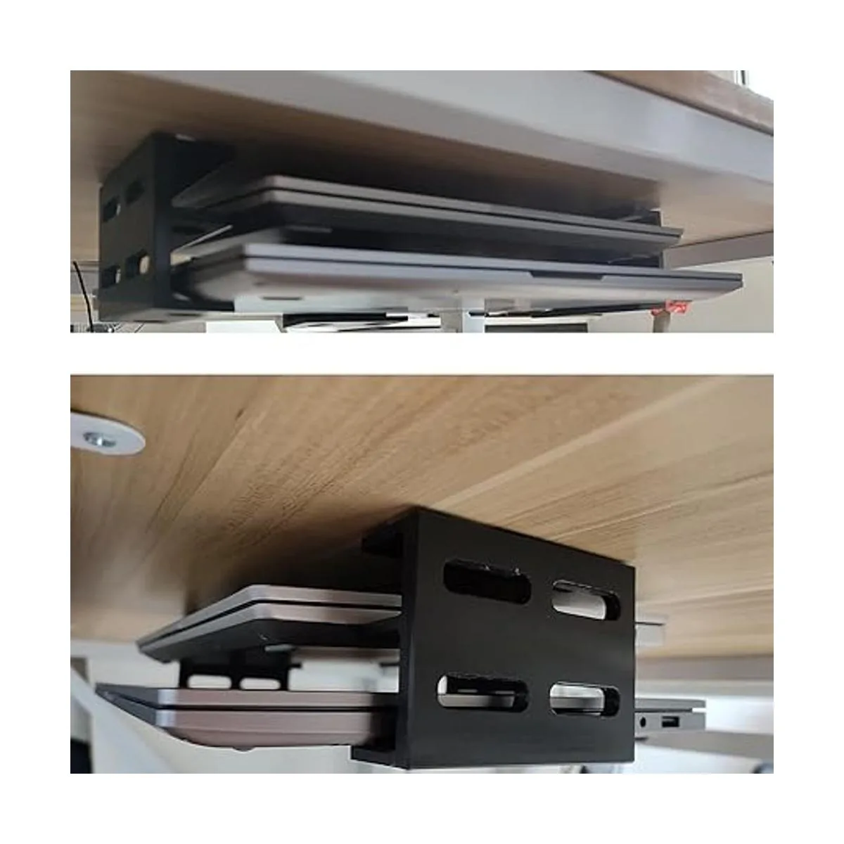 Diseño: el soporte ergonómico para laptop de doble piso debajo del escritorio se monta de forma segura debajo de tu escritorio, almacena tu laptop debajo del escritorio para liberar espacio en el escritorio, utiliza el espacio desperdiciado debajo del escritorio.