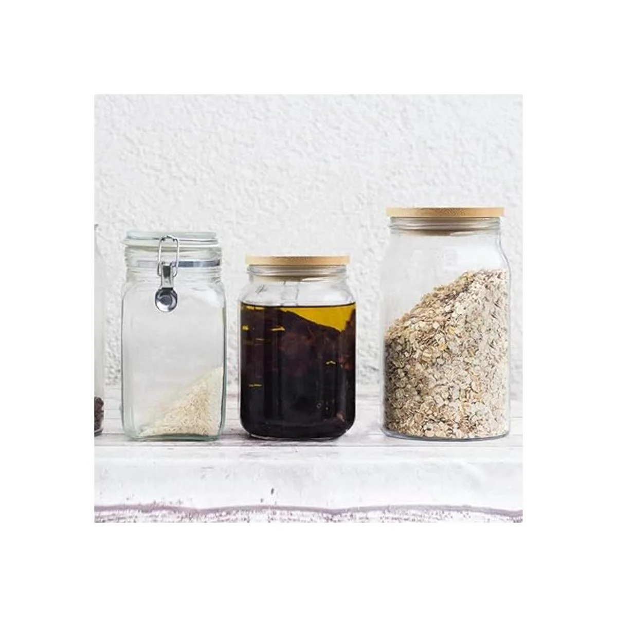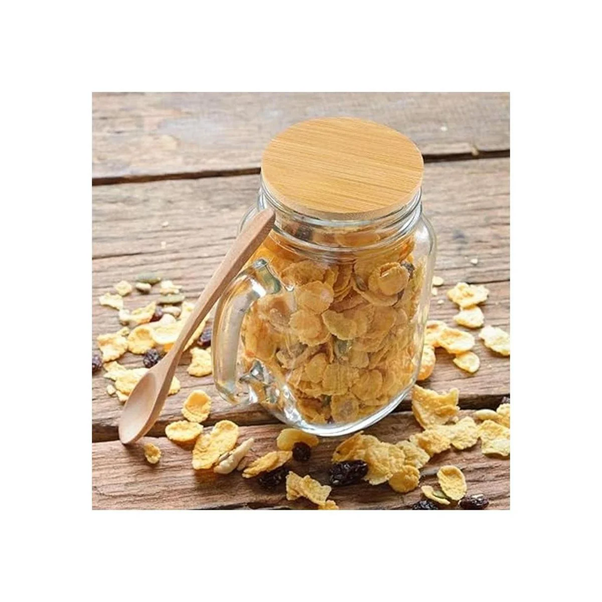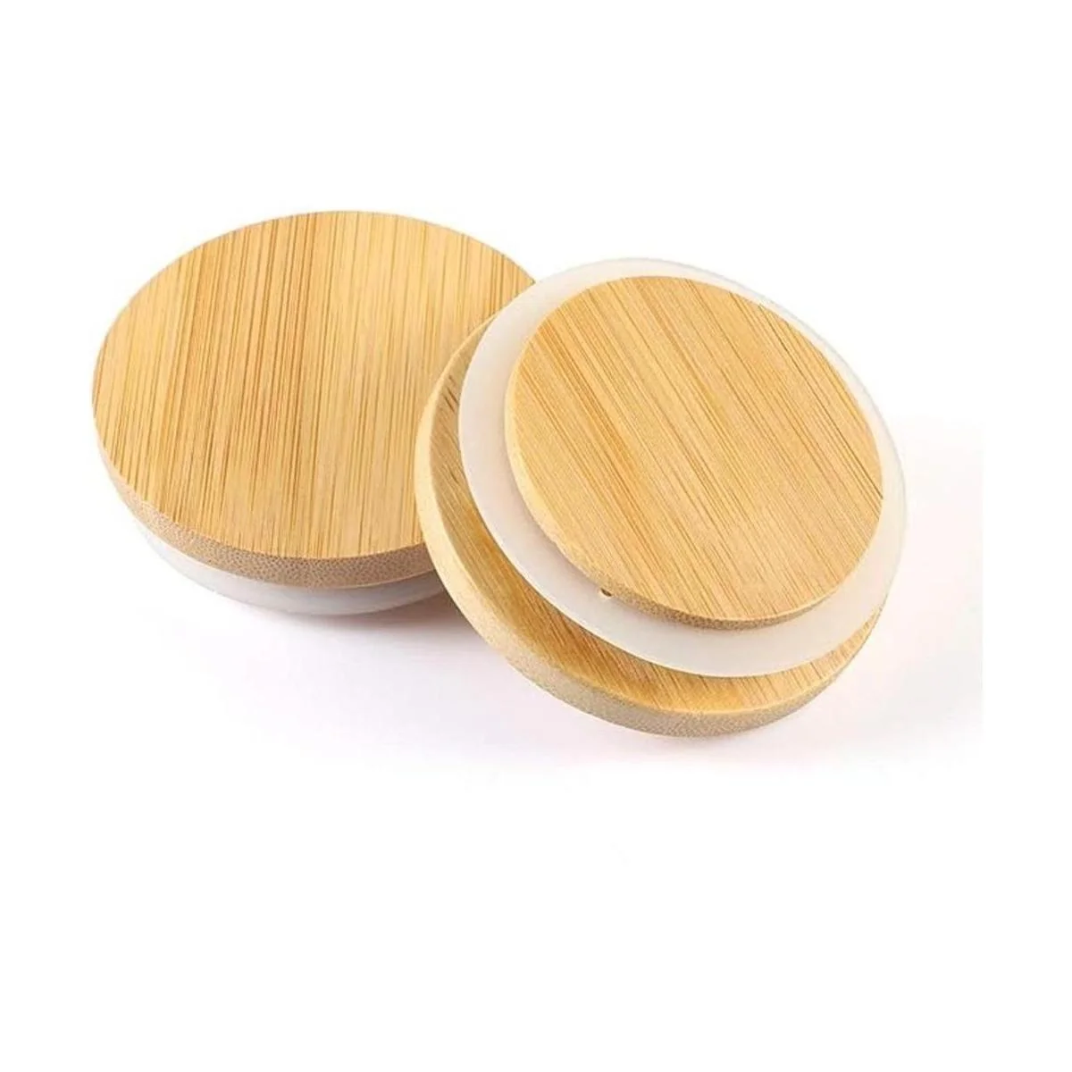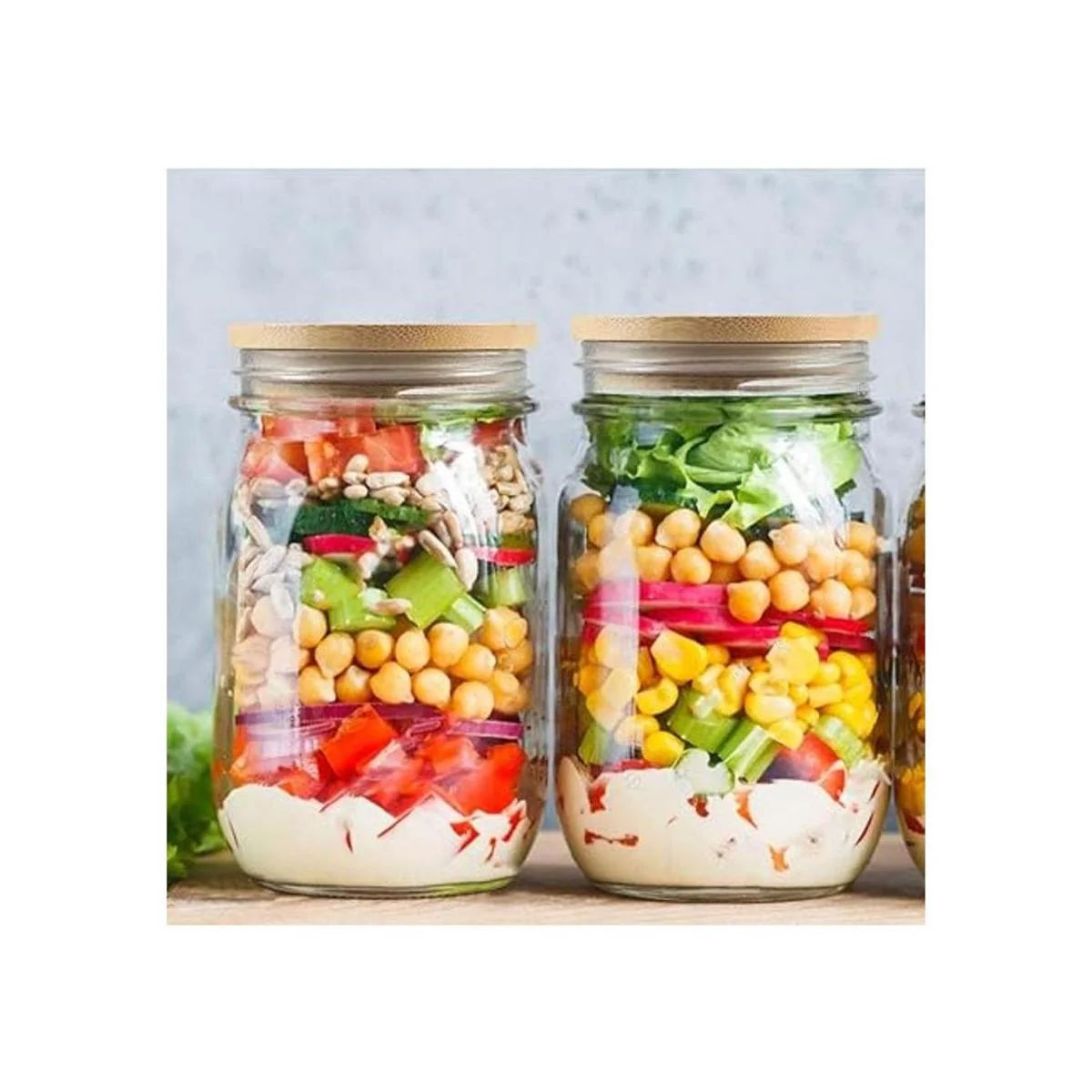 Almacenamiento sellado: este diseño de tapas de bambú sin agujeros para pajitas, combinado con un anillo de silicona para formar un entorno de almacenamiento sellado, que se puede utilizar para almacenar sobras, salsas frescas o jugo, almacenar tornillos y uñas, almacenamiento en seco, especias y mucho más.