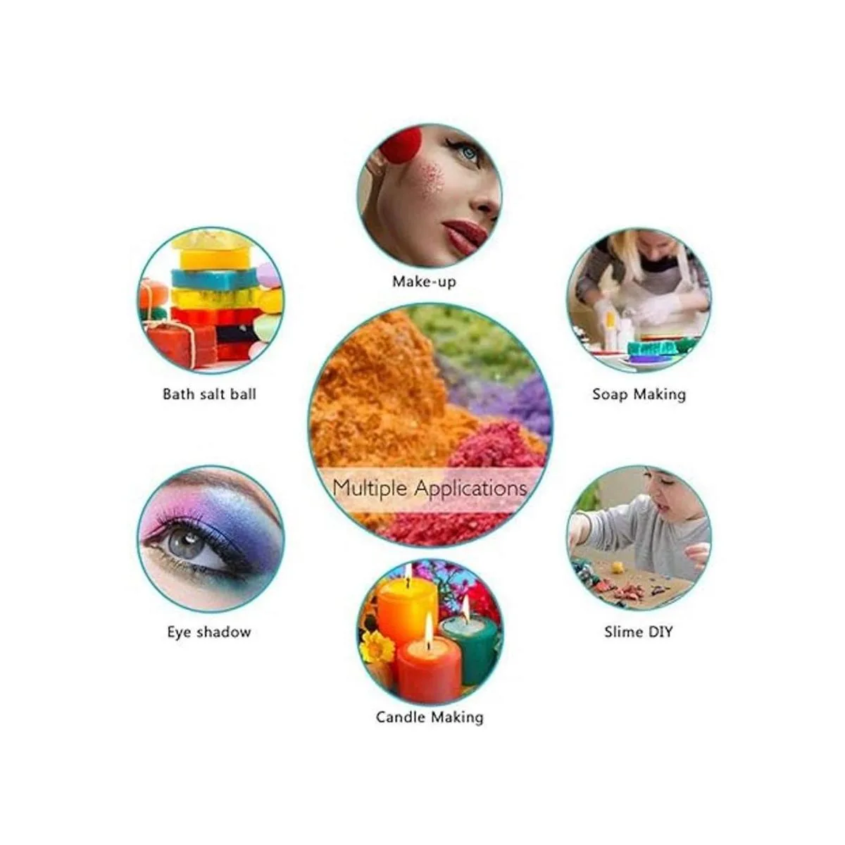 Múltiples aplicaciones: el polvo de pigmento de mica se puede utilizar para colorear resina epoxi, pintura, fabricación de jabón, slime, vaso, resina de plástico, proyectos de manualidades y joyas. Y el tinte epoxi es perfectamente adecuado para fines de maquillaje como sombra de ojos, rubor, arte de nair poish