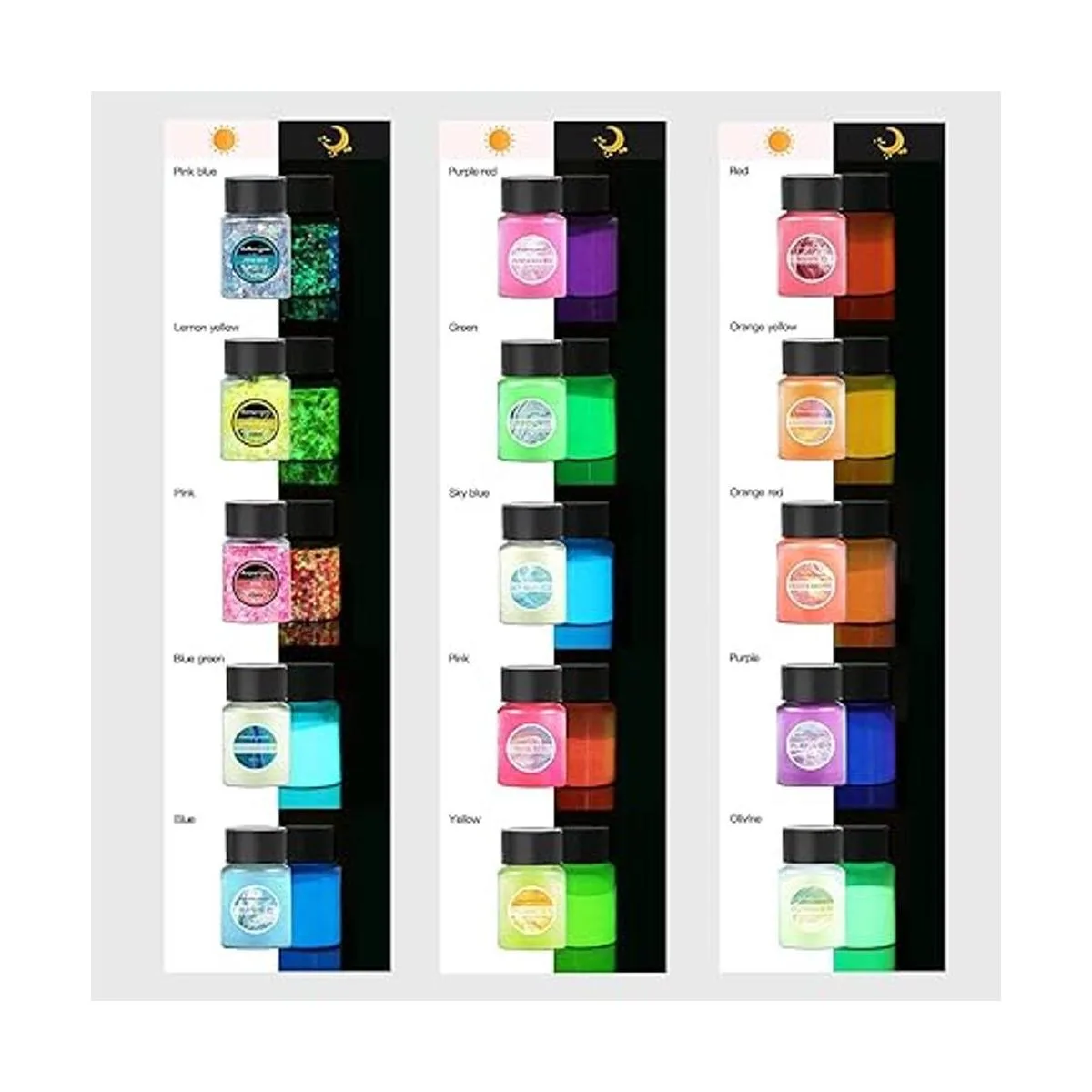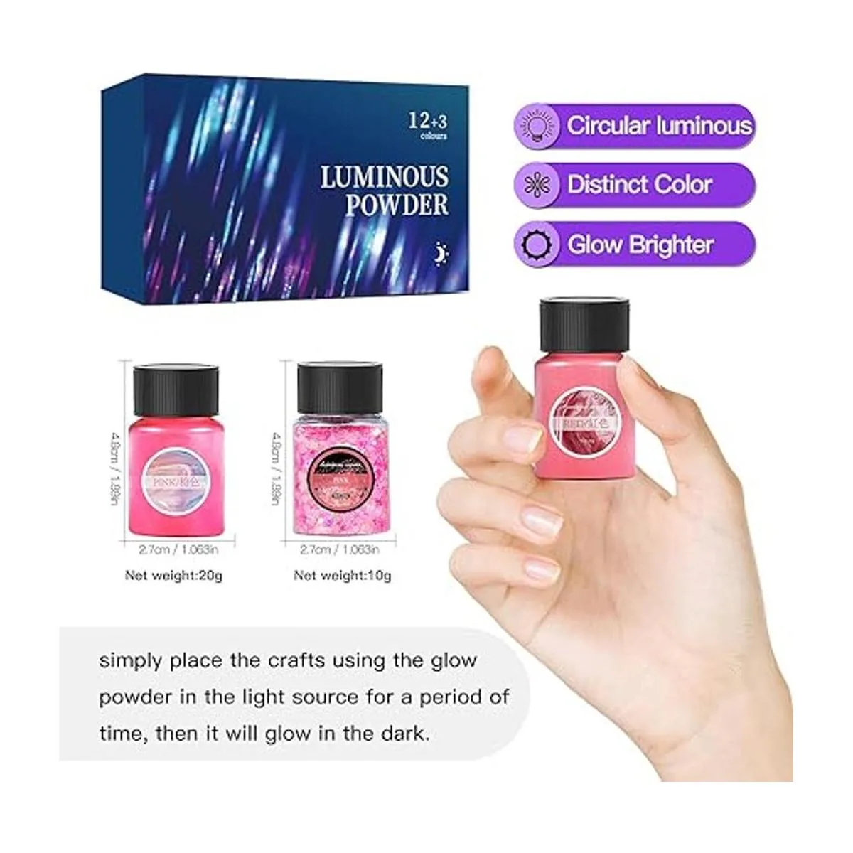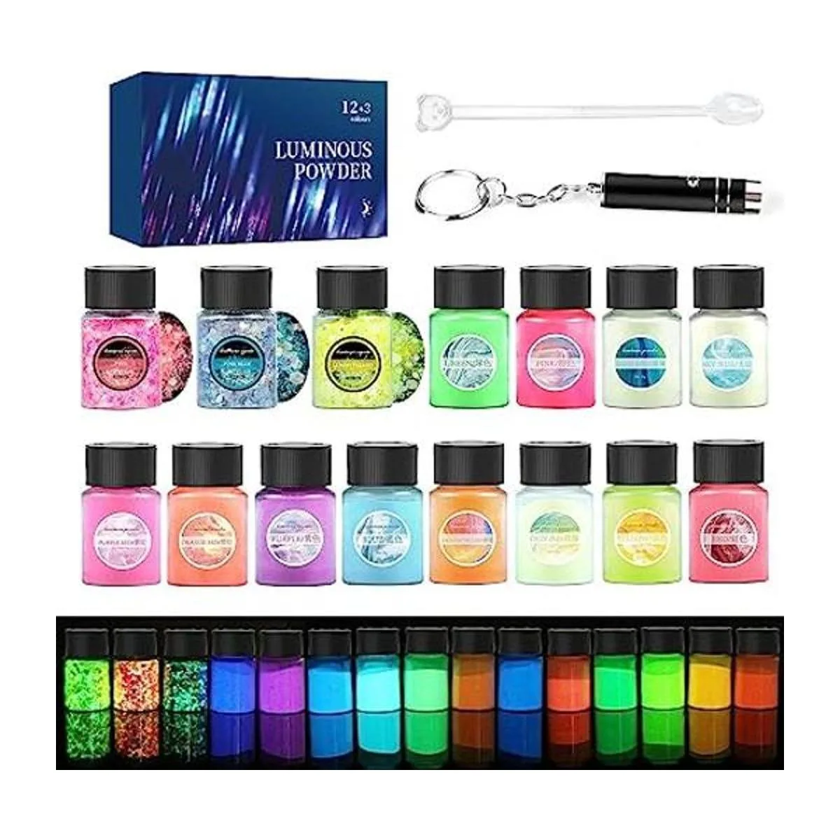 Pigmento de 12 colores, 3 colores, más opciones: 12 botellas de polvo luminoso, 0.71 oz por botella. 3 botellas de copos luminosos, 0.35 oz por botella. La tecnología avanzada hace que el polvo sea más brillante y duradero en la oscuridad. Fácil de usar, no más residuos ni desorden.