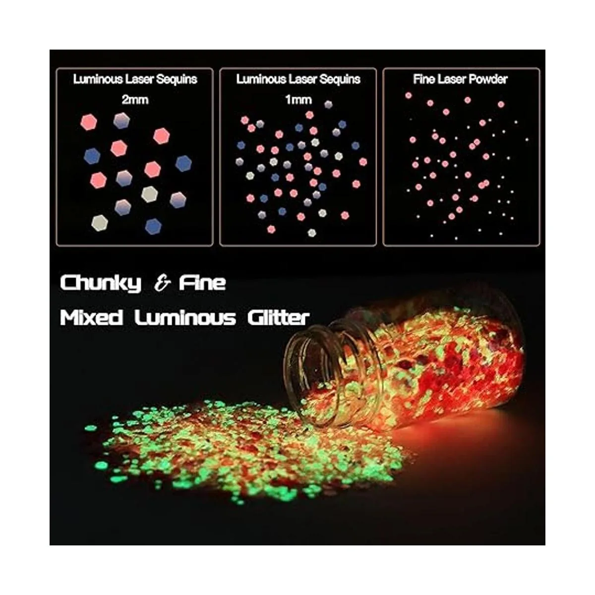 No tóxico y seguro para la piel: nuestro polvo que brilla en la oscuridad está hecho de partículas finas de primera calidad, que no son tóxicas y no tienen crueldad animal para la piel sin olor. Se puede utilizar en arte corporal y de uñas.