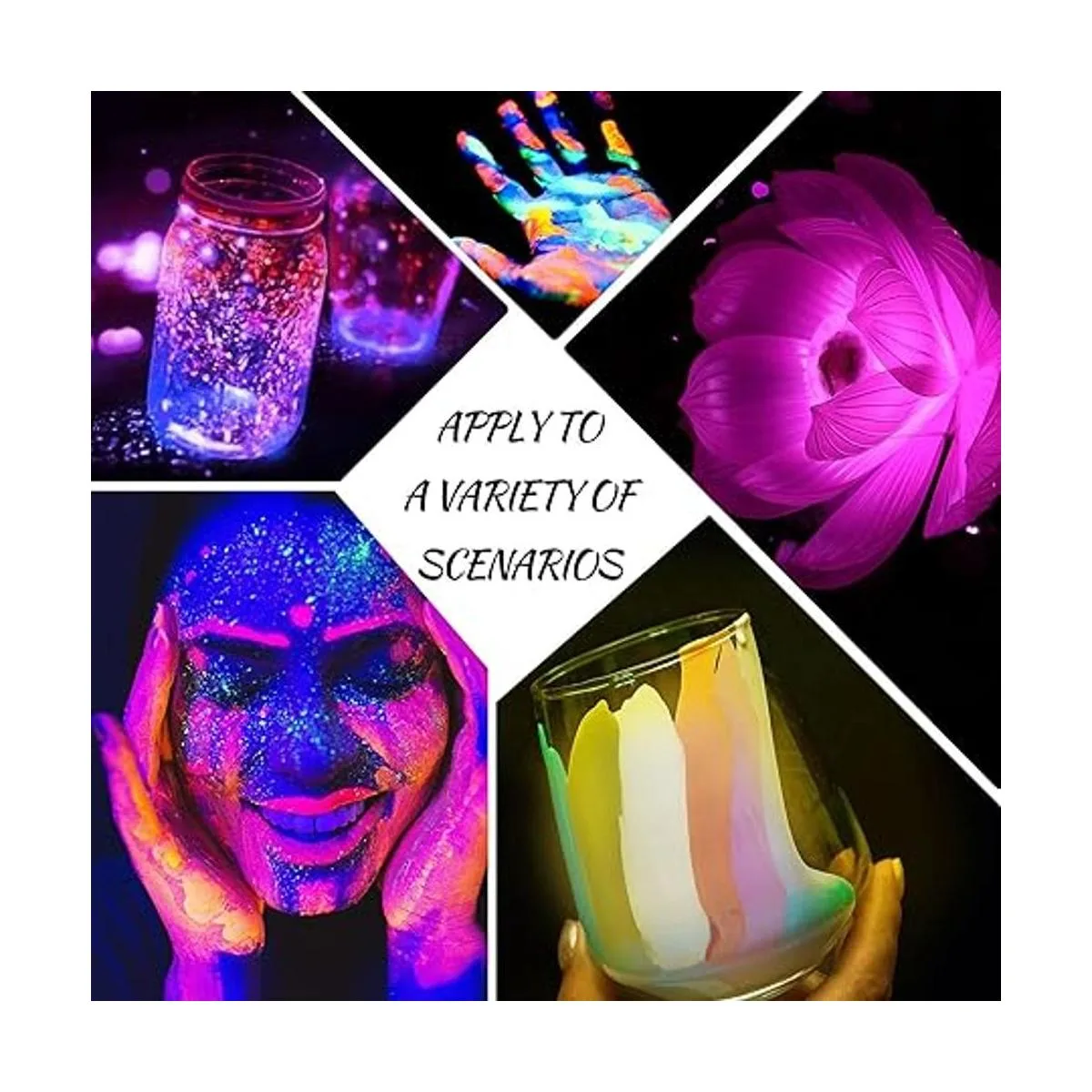 Múltiples usos: libera tu creatividad: el tinte de pigmento fluorescente se puede aplicar en resina epoxi, resina UV, slime, bombas de baño, arte de uñas, bellas artes, pinturas y manualidades. Perfecto para dulces de Halloween o truco, festivales, regalos de Navidad, carreras de color, fiestas temáticas y muchas más actividades por la noche.
