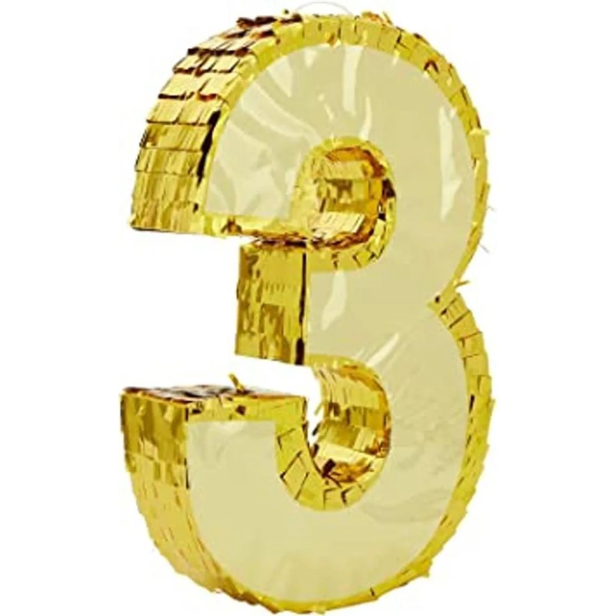 Qué incluye: incluye 1 piñata dorada con número 3 para añadir a tus decoraciones de tercer cumpleaños para niños