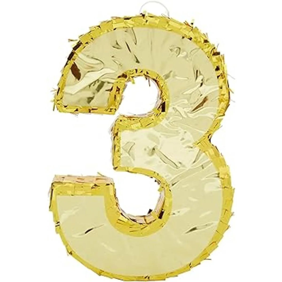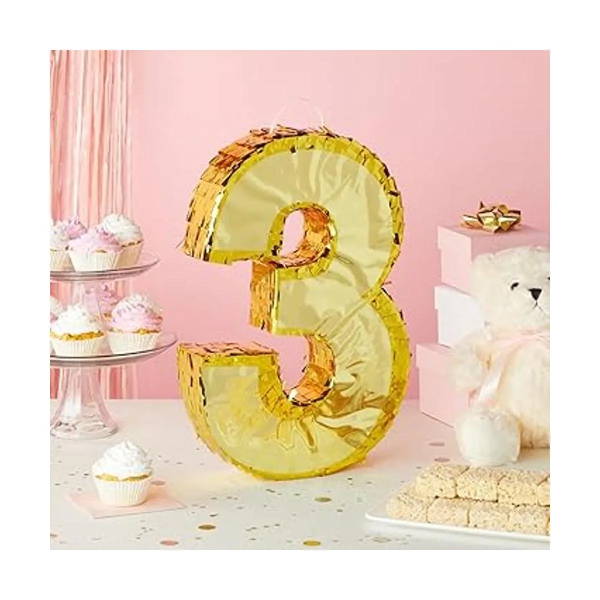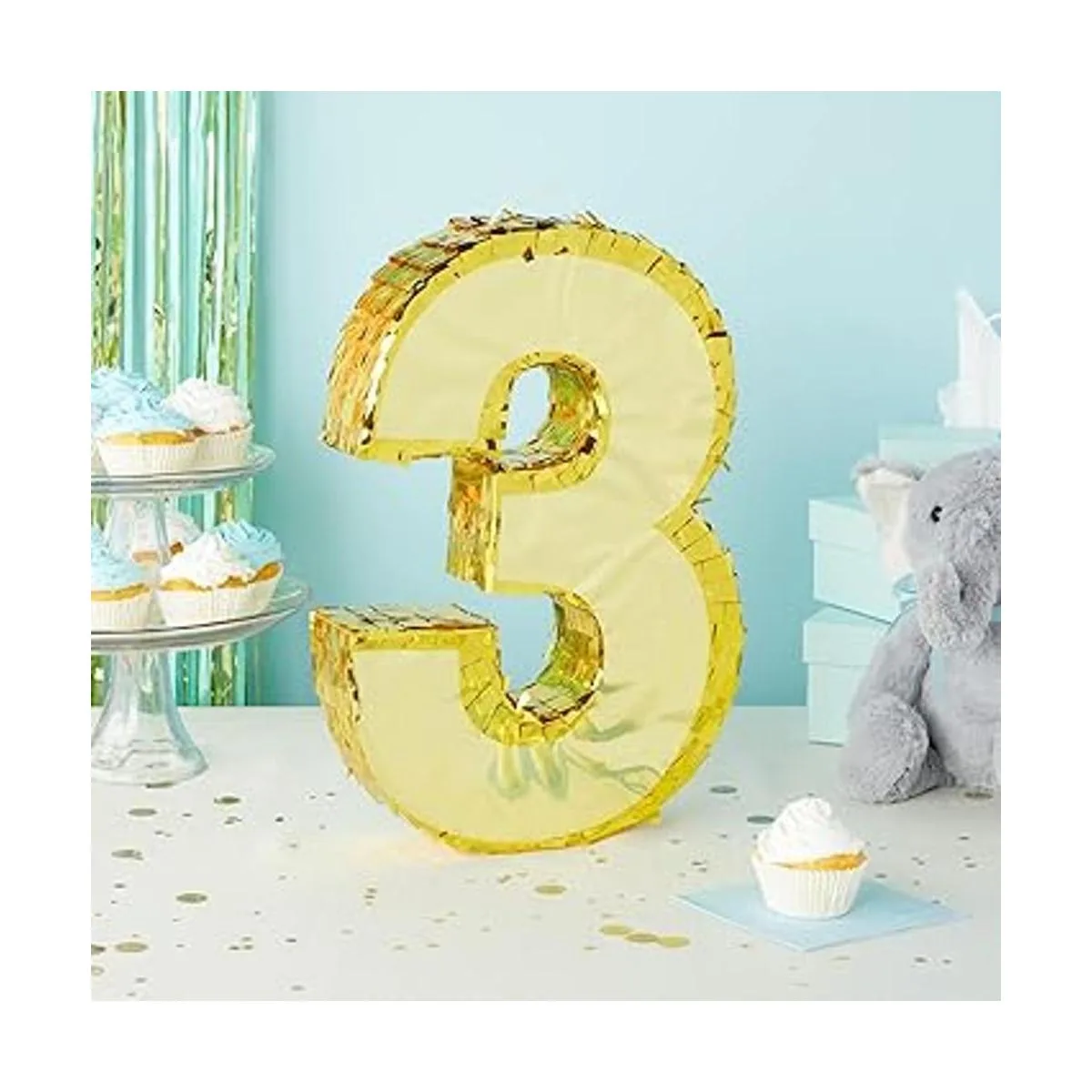 Suministros de fiesta de tercer cumpleaños: Impresiona a tus invitados con un tema festivo y un divertido juego de fiesta en una próxima fiesta de cumpleaños infantil con esta piñata número 3 de lámina dorada