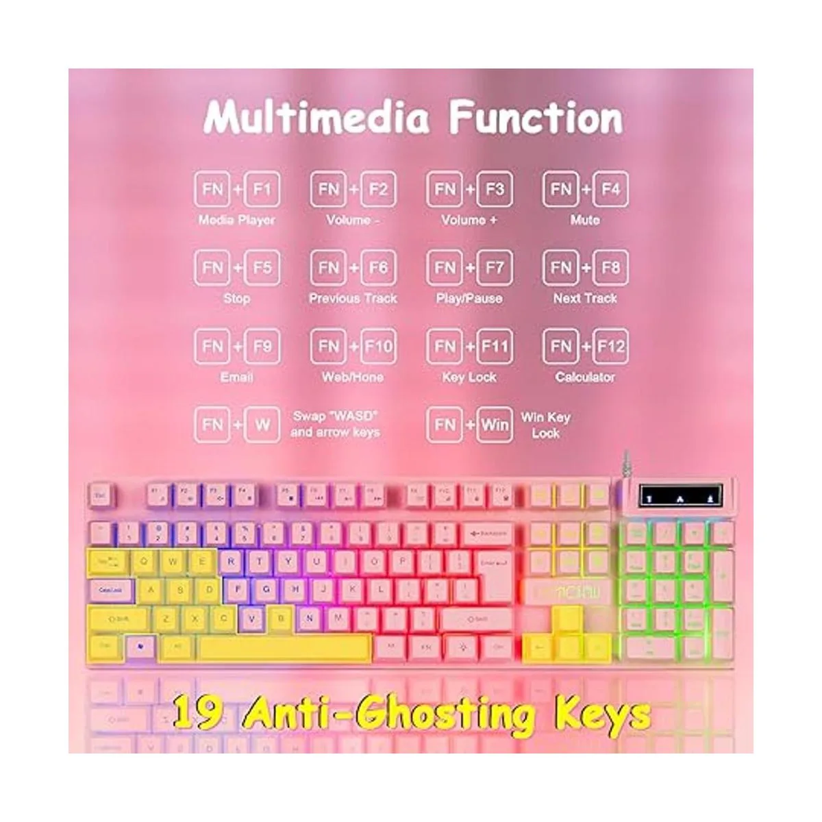 Multifunctional keys for gaming keyboards The cute keyboard with standard 104 classic layout keys, 12 multimedia function keys and number pad. Up to 19 keys antighosting. FNW to swap WASD and arrow keys. FNWin to disable the Win key for ultimate gaming experience.