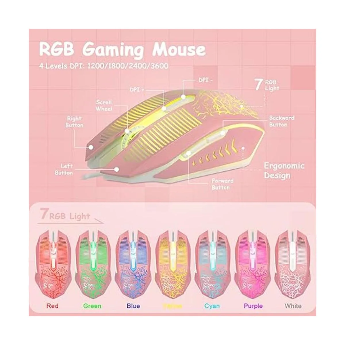 Gaming Mouse Ergonomically designed construction7 buttons, supporting 4 levels 1200/1800/2400/3600 of DPI adjustment. It is good for you playing games, the mouse can move exactly whatever and wherever you want. While playing games, the keyboard and mouse can create a dazzling lighting ambience effect.