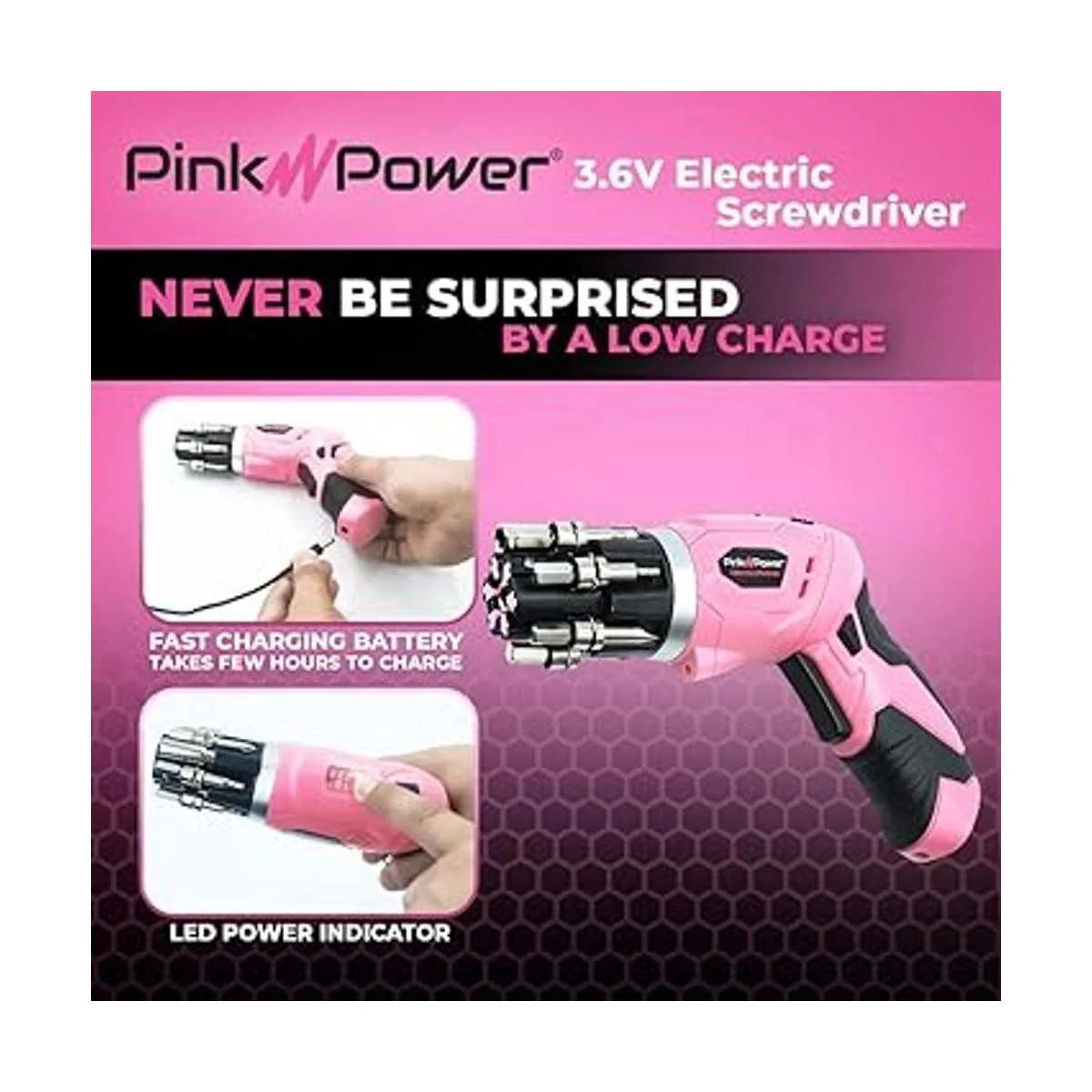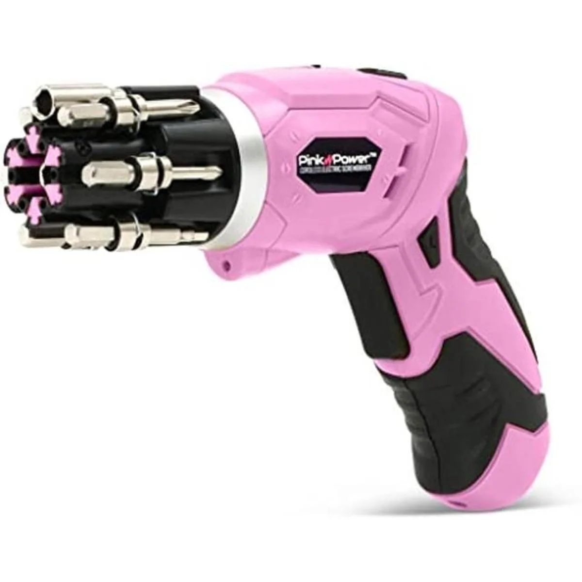 Pink Power, taladro eléctrico de 4,8 Volt, recargable, juego de desarmadores con nivel de burbuja.