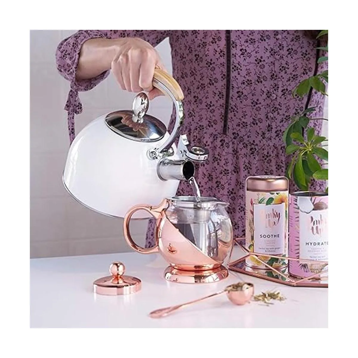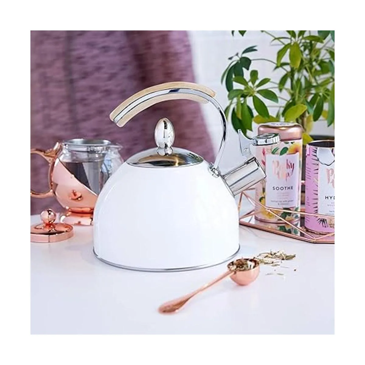 Llamativo y elegante: el hervidor de té Presley cuenta con un colorido cuerpo de acero inoxidable y una sofisticada asa de bambú. Por qué usar un hervidor aburrido cuando puedes tener este hervidor de inducción brillante para adornar tu estufa
