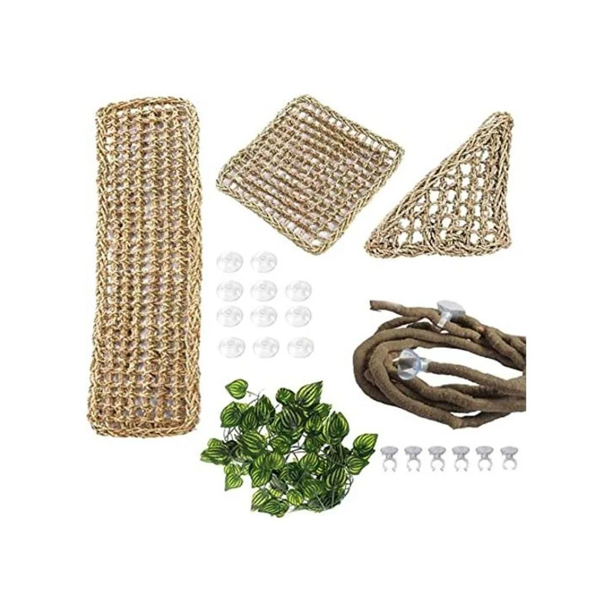 El paquete incluye: 1 hamaca triangular de lagarto, 1 hamaca rectangular de dragón barbudo, 1 hamaca cuadrada de junco marino, 1 hoja de reptil, 1 enredadera decorativa flexible para reptiles, 17 ventosas. Perfecto para reptiles y anfibios. Adecuado para dragones barbudos, lagartos, serpientes, gecos, tortugas. es, tortugas, Ranas de árbol, camaleones y otros reptiles.