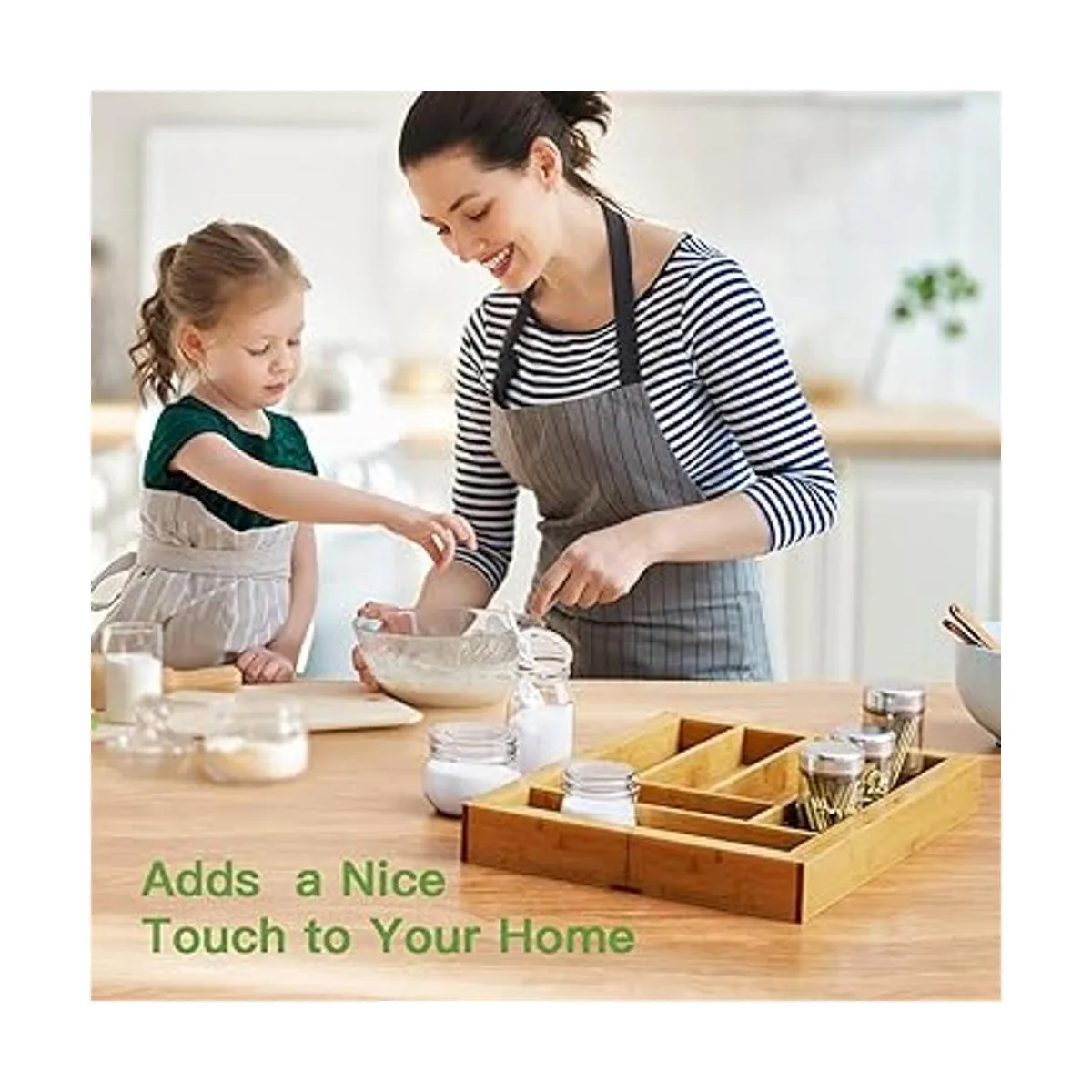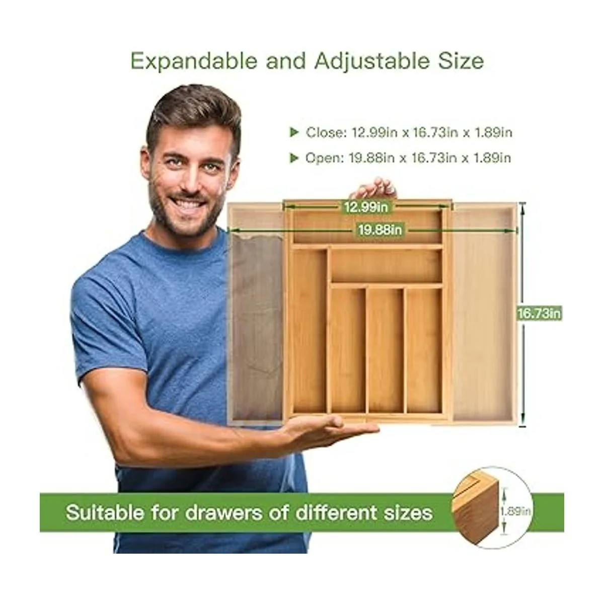 Construcción resistente y fácil mantenimiento: este organizador de cajones de utensilios de cocina es lo suficientemente resistente como para almacenarlo en su lugar. Y este organizador de bambú se puede limpiar rápidamente con agua tibia y simplemente se limpia con un paño húmedo.