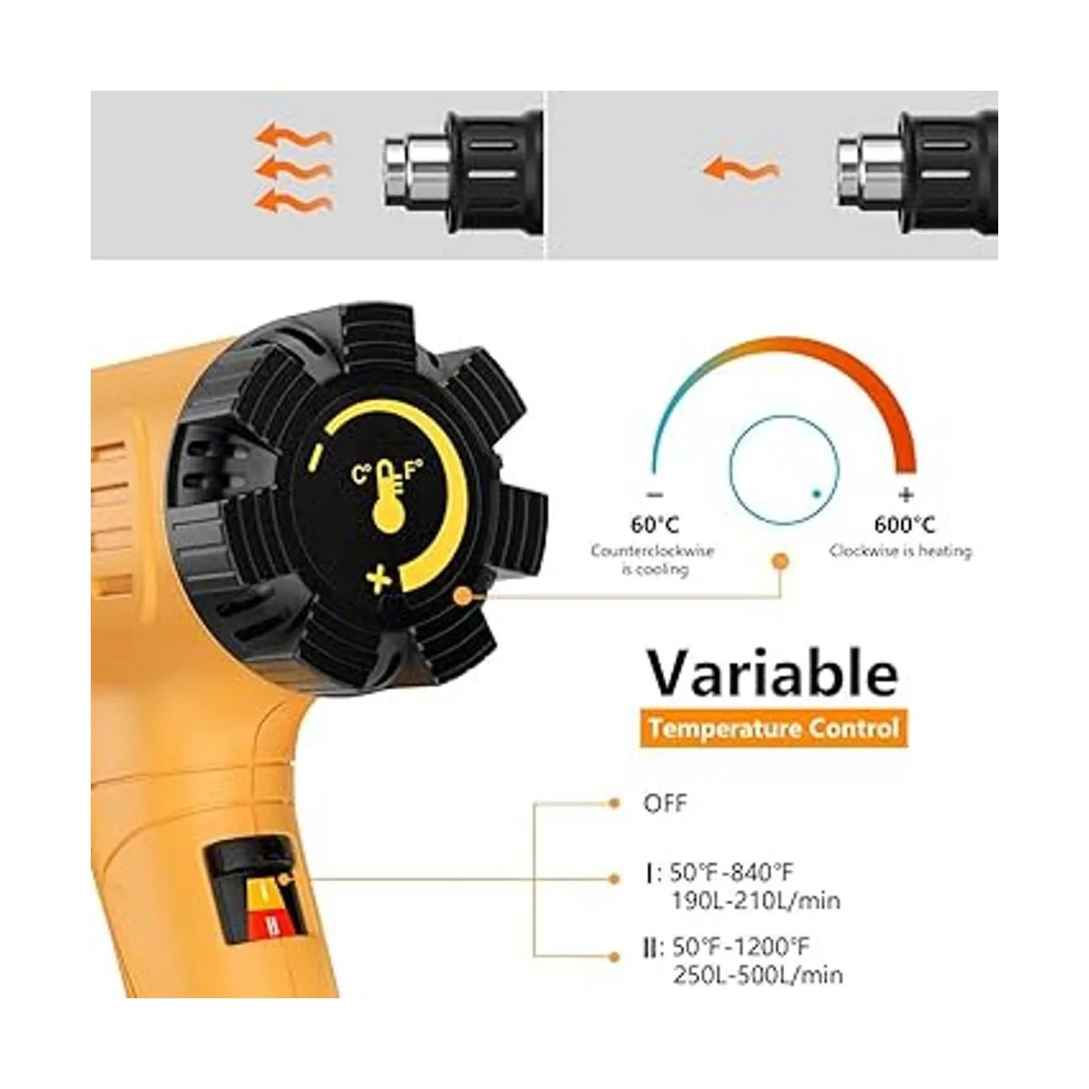 Temperatura variable con 2 modos: la temperatura variable se puede ajustar girando la cubierta trasera. El rango de temperatura es de 50 a 1,112.0 F. Hay dos modos para flujo de aire, ajuste bajo 122.0842.0 F, 190210 L/min, ajuste alto 122.01,202.0 F, 250500 L/min.