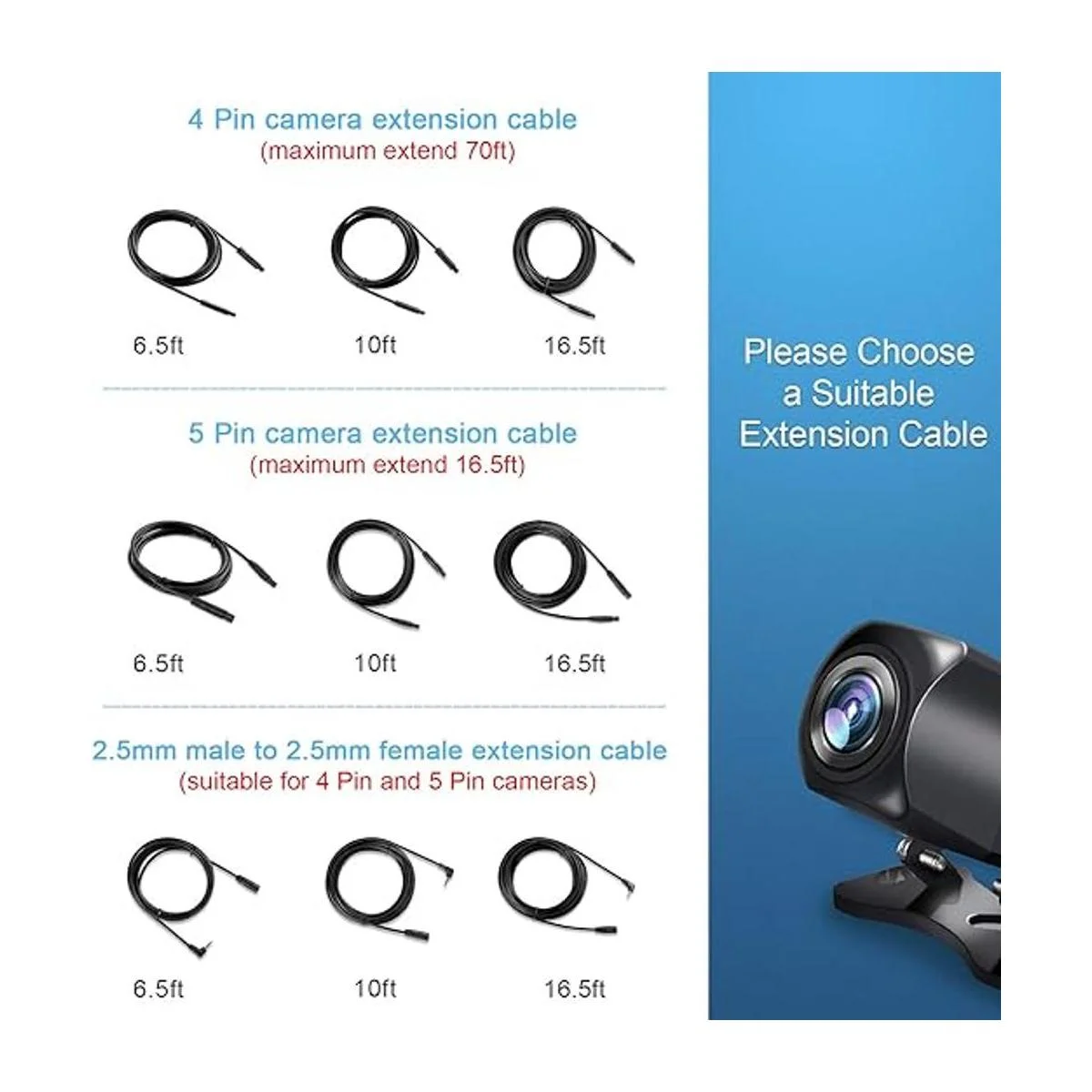 Elige el cable de extensión adecuado para cámara de visión trasera, 3 tipos de conector: 4 pines macho a hembra, 5 pines macho a hembra, 0.098 in extremo macho a hembra. Cada tipo de cables de extensión de cámara de salpicadero tiene diferentes longitud: 6.6 ft, 9.8 ft, 16.4 ft.