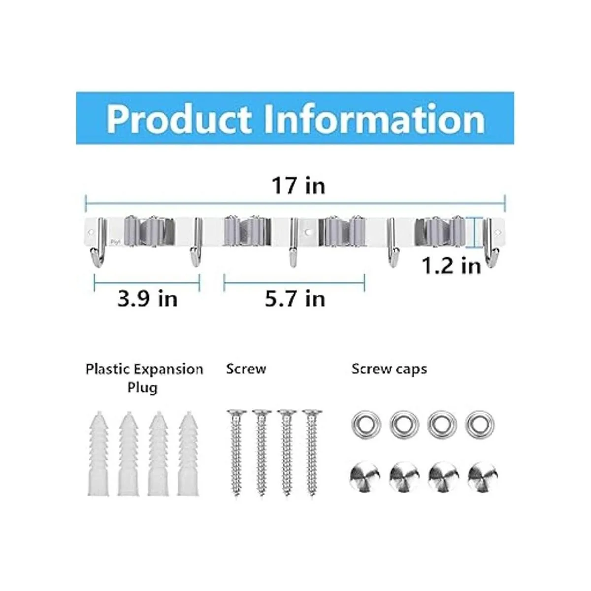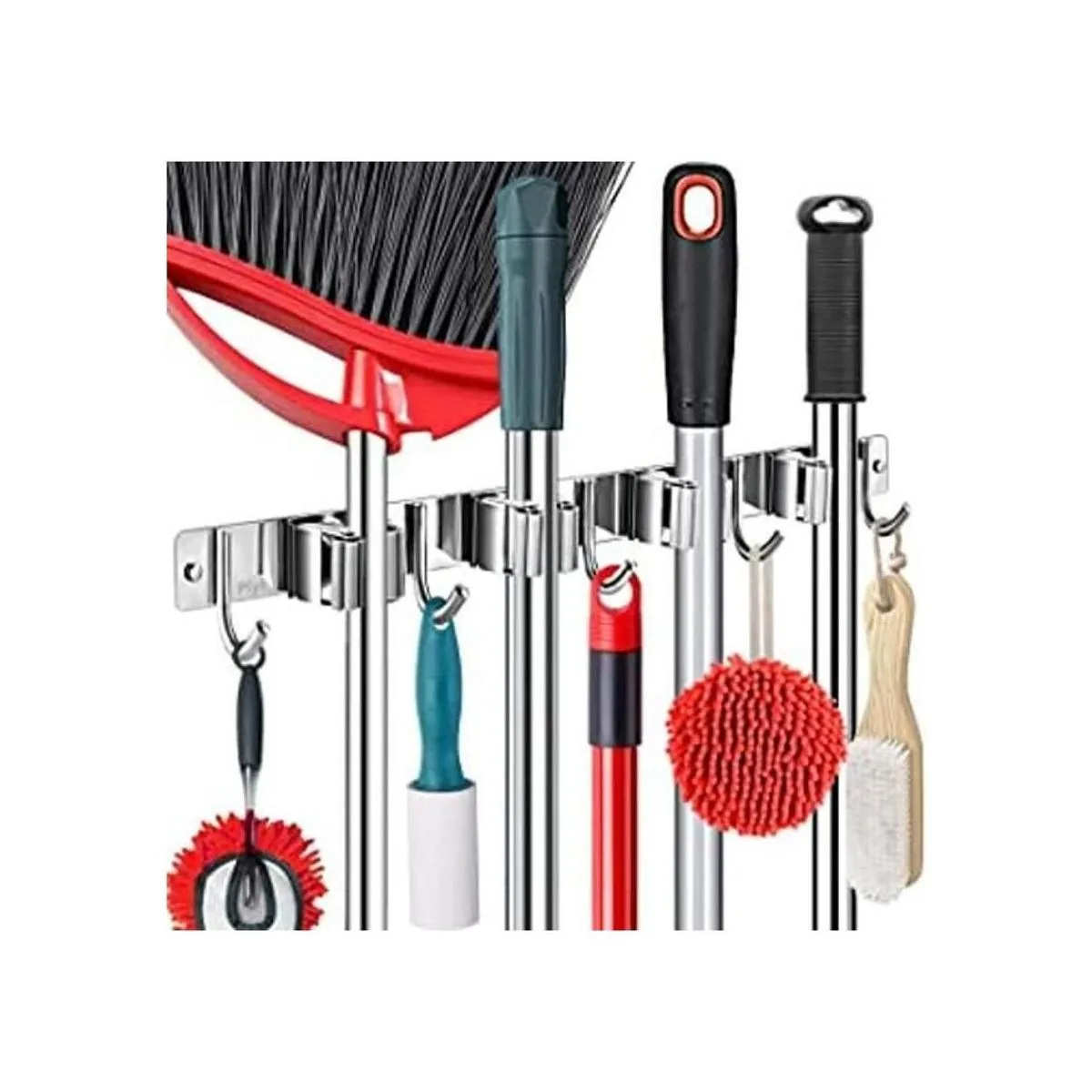 Piyl Soporte para escoba para trapeador de pared, organizador de escoba de acero inoxidable montado en la pared, ganchos de organización de almacenamiento resistentes para el hogar, cocina, jardín, garaje, estante de lavandería 4 estantes, 5 ganchos