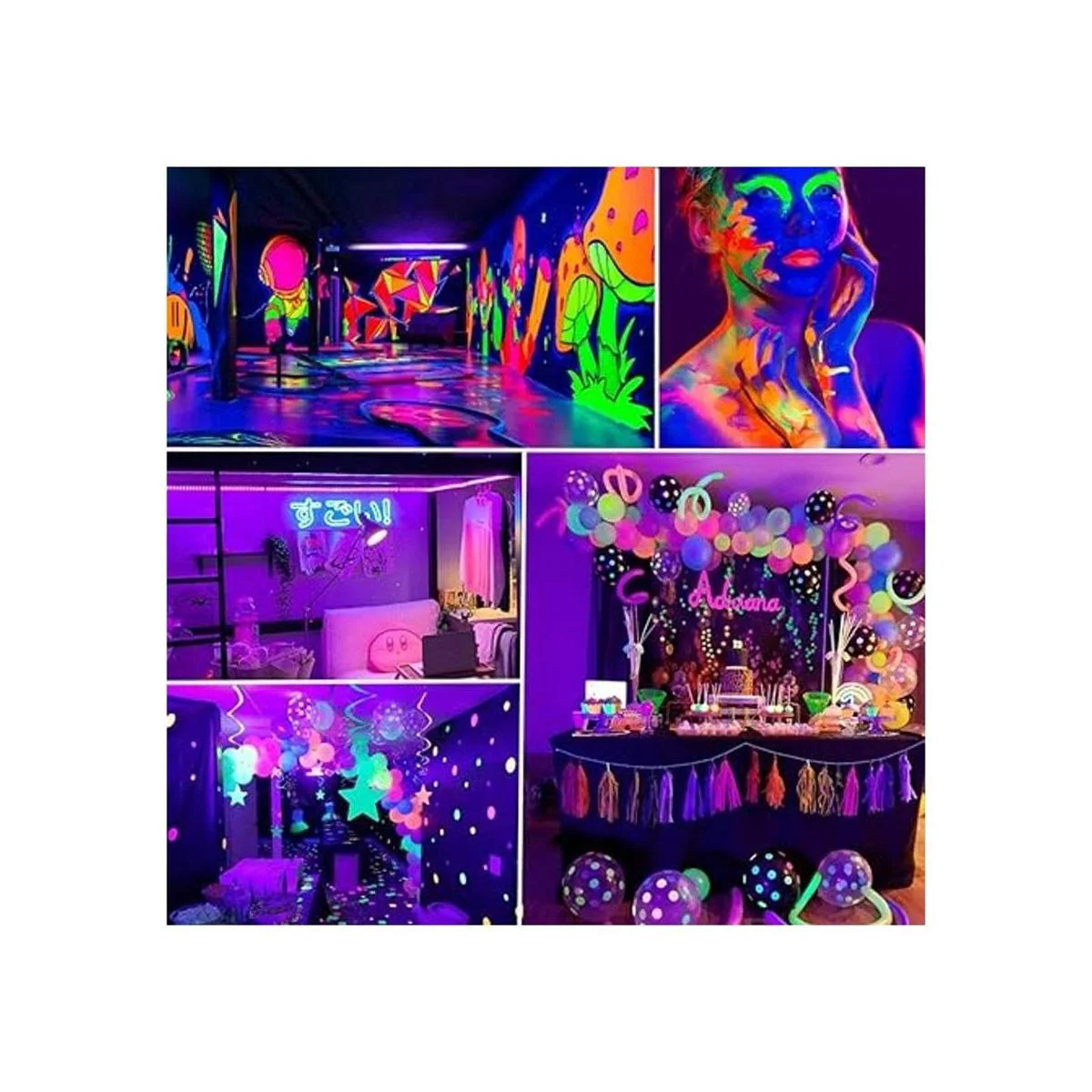 Seguro y ampliamente utilizado: más seguro que la luz negra de 365 nm. Muy adecuado para pintura corporal, carteles fluorescentes y exhibiciones de pintura. Fuente de luz táctil, extremadamente baja generación de calor. Es la primera opción para decoración de habitaciones, fiestas de cumpleaños, iluminación de escenario, eventos de Navidad y actuaciones de banda. Si tienes alguna pregunta, no dudes en ponerte en contacto con nosotros. Te responderemos en 24 horas.