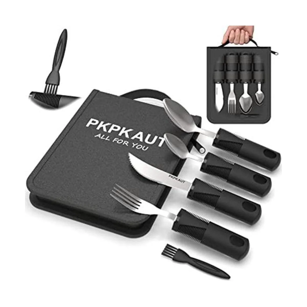 Juego de viaje portátil: juego de 6 piezas a juego, utensilios de alimentación de mango grande, incluyendo cuchillo de artritis, cuchara ligera y tenedor para temblores, cepillo de limpieza y bolsa Oxford. Cubre una amplia gama de opciones de comida. Fácil de llevar a cualquier lugar que necesites
