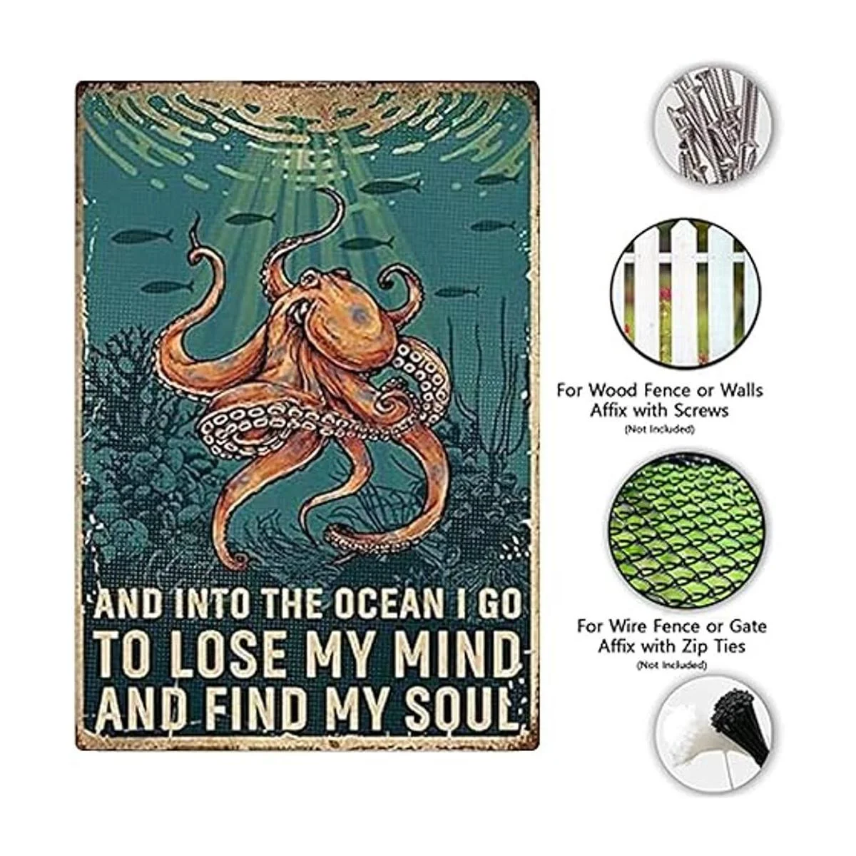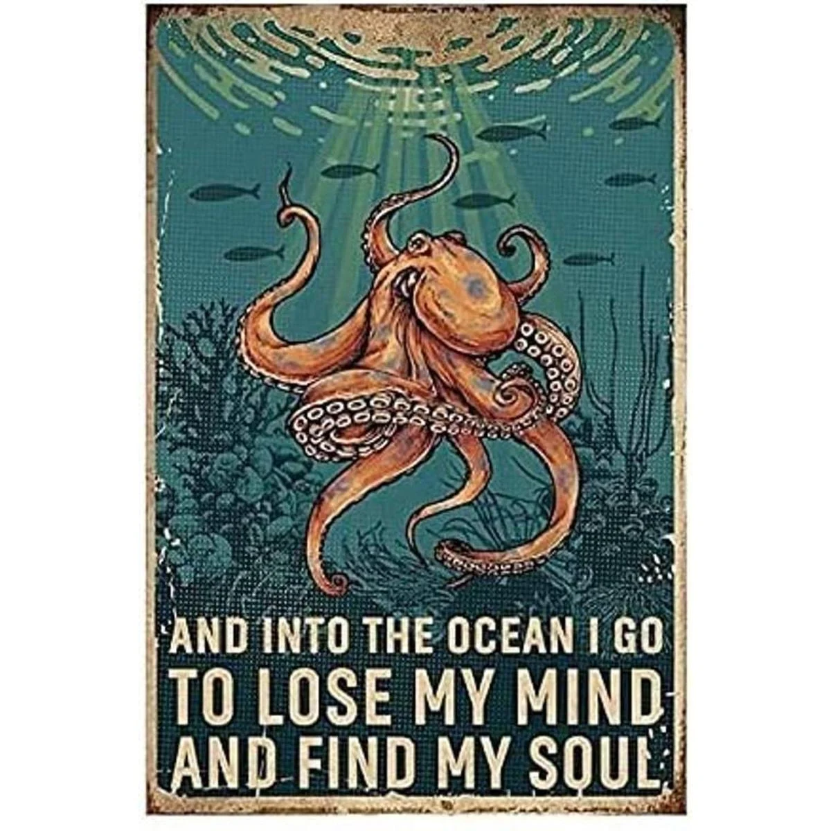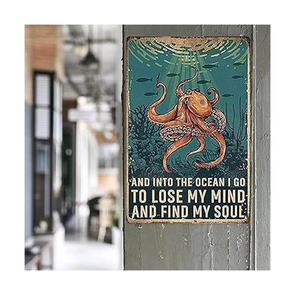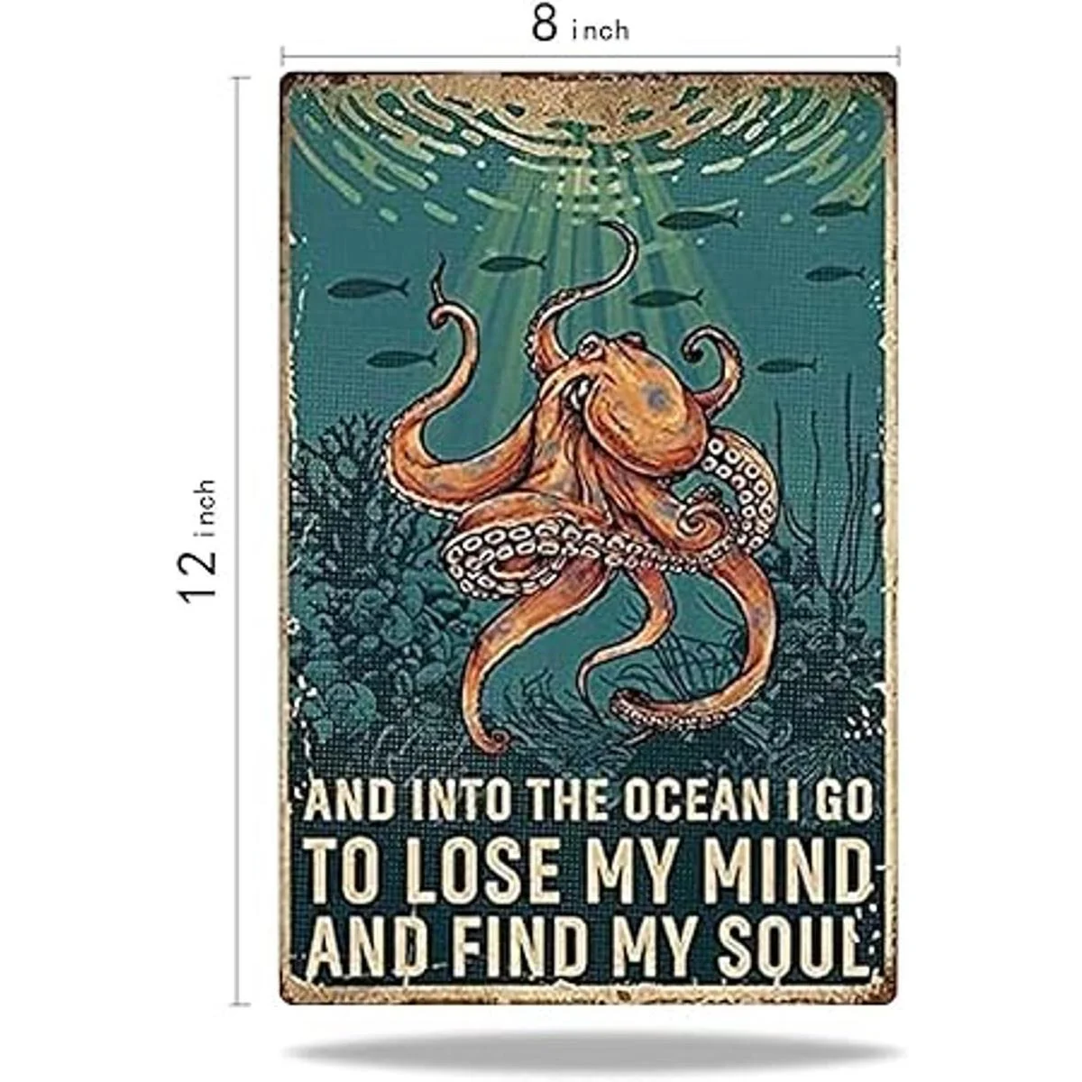 Placa de metal de pulpo, y en el océano I Go to Lose My Mind and Find My Soul, decoración de pared de metal de aluminio, letrero retro para casa, cocina, personas, cueva, sala de estar, regalo de 7.9 x 11.8 in
