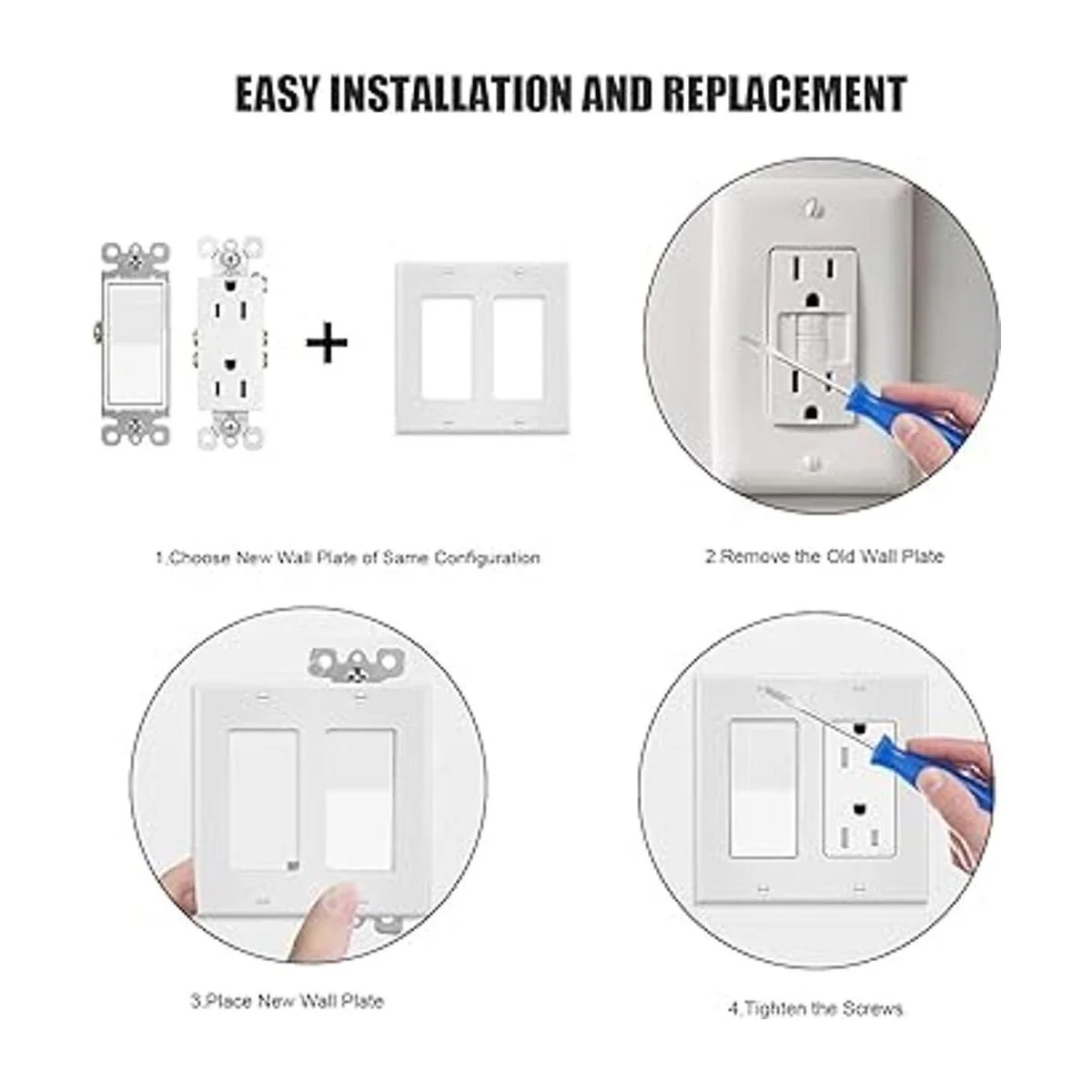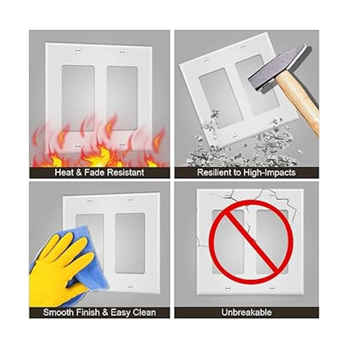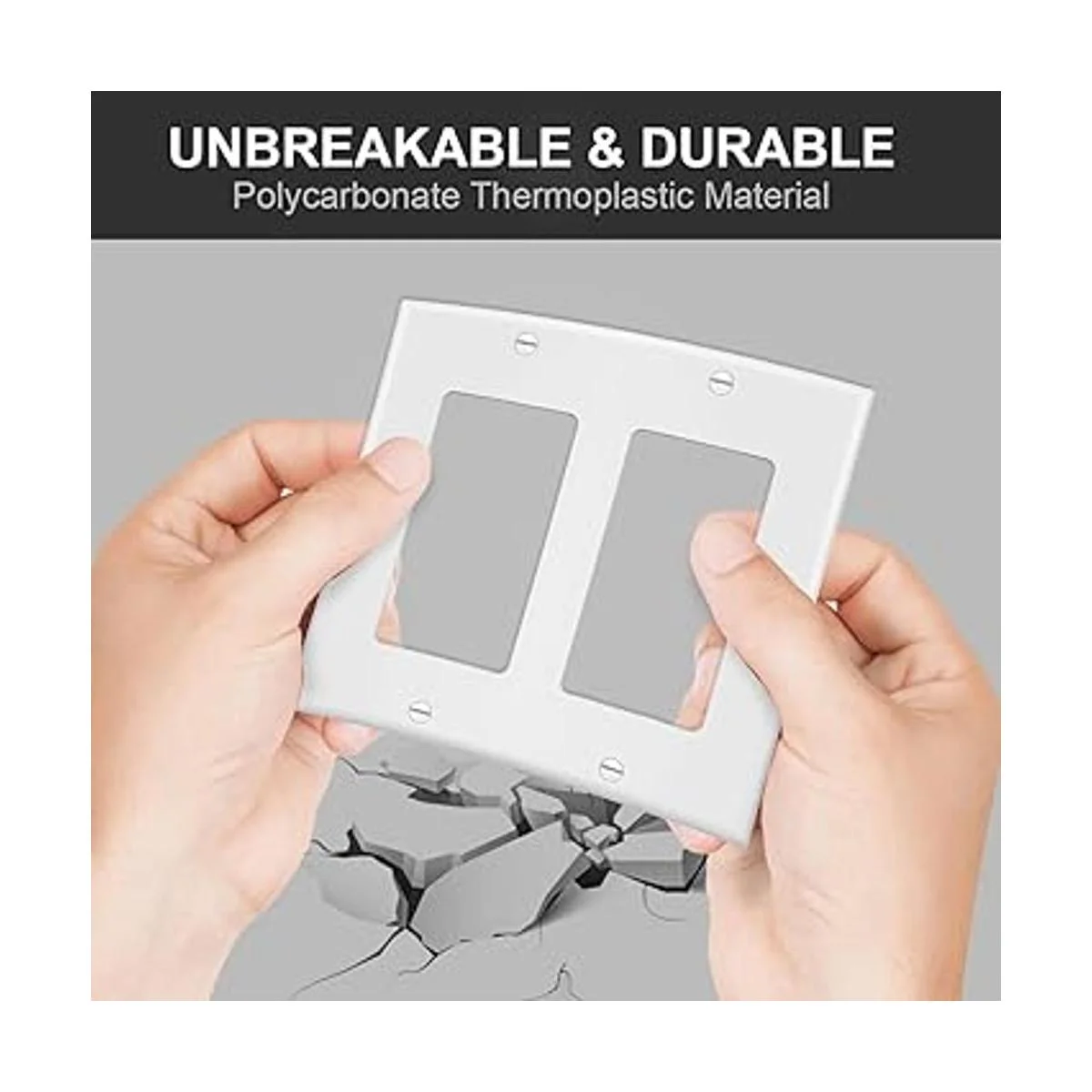 Las cubiertas de interruptor de 2 bandas están hechas de policarbonato termoplástico irrompible, es flexible y resistente que puede soportar impactos duros y fuerza pesada. Las placas de doble pared funcionan con todo tipo de interruptores y salidas de estilo decorador, incluyendo regulador, interruptor de luz, interruptor inteligente, interruptores de temporizador, salidas GFCI, tomas eléctricas, etc