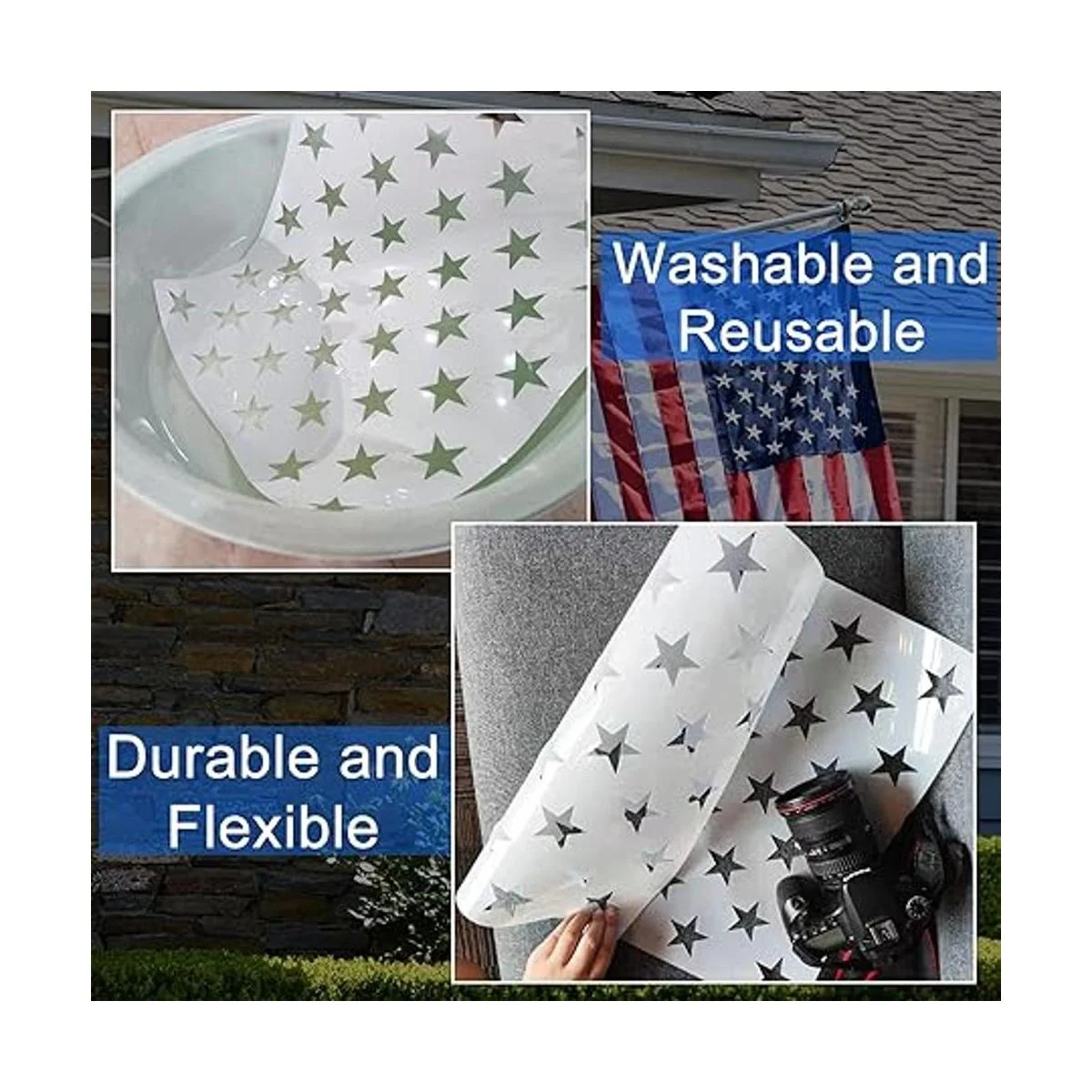 Alta calidad La plantilla de estrella de la bandera de Estados Unidos está hecha de PET, duradera, flexible, inodora, lavable y reutilizable. Diseñado para un uso duradero.