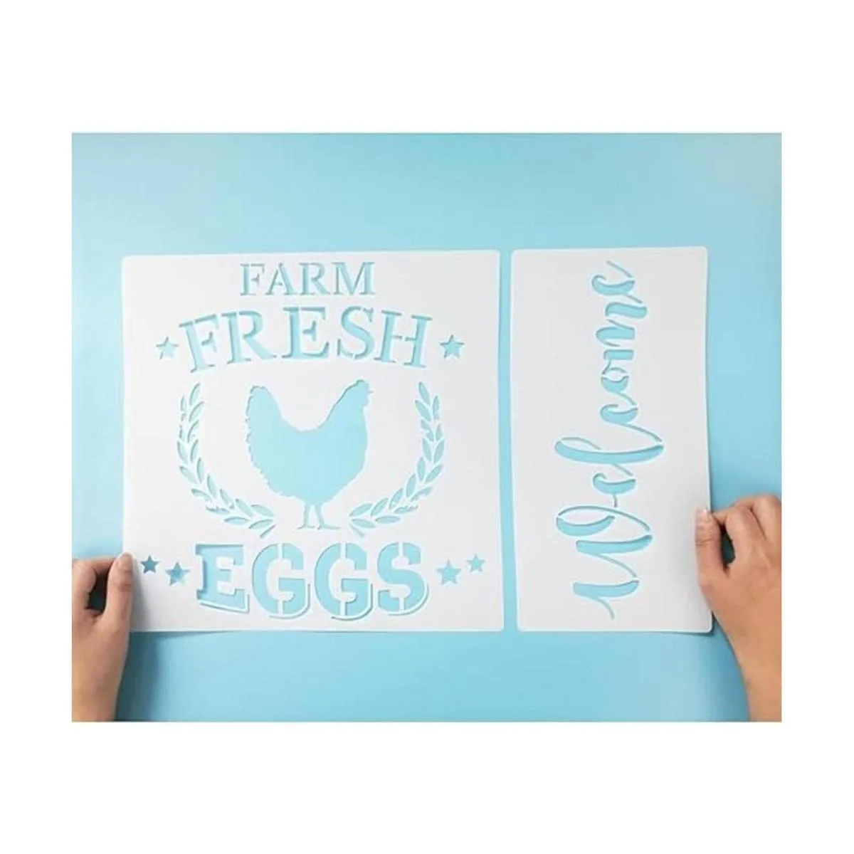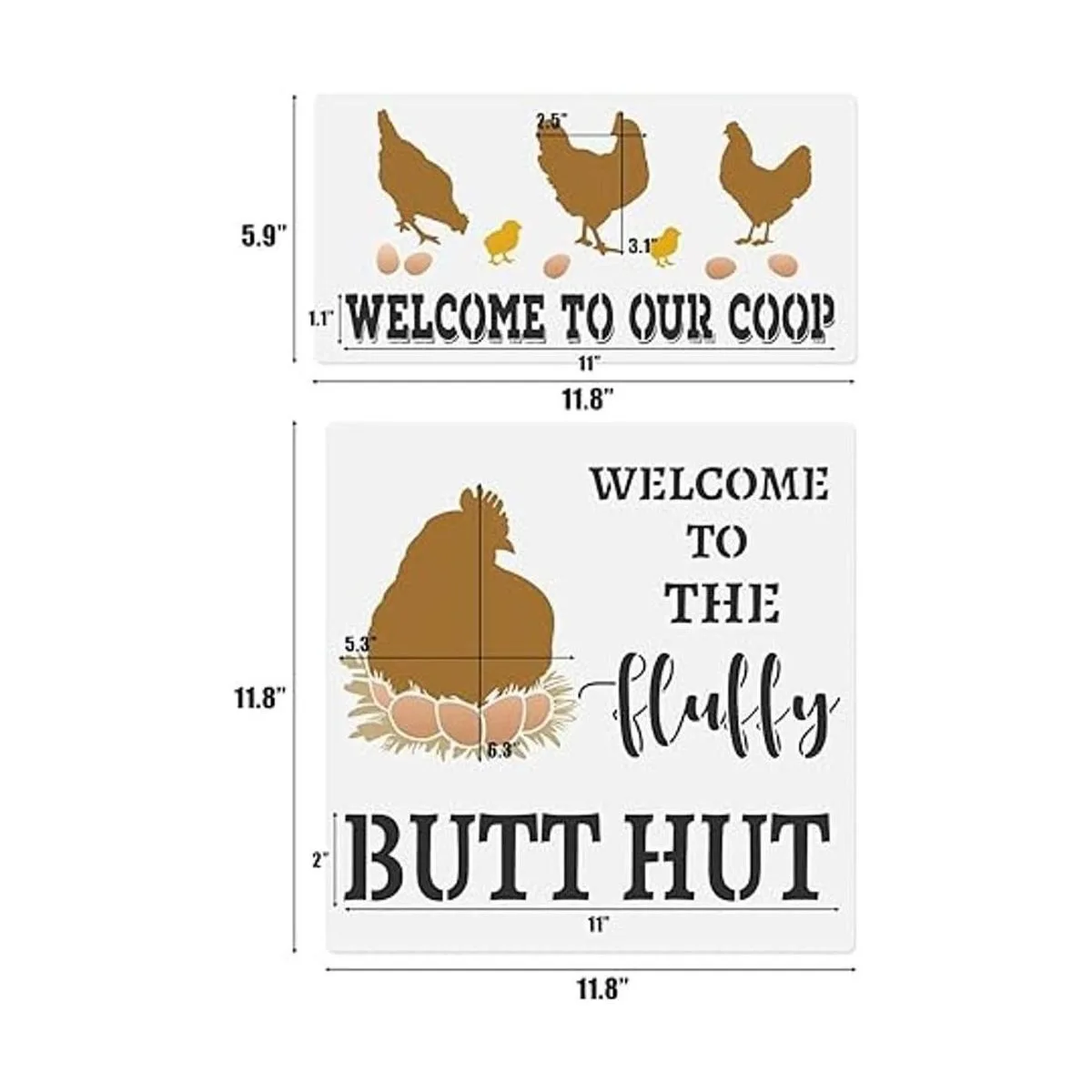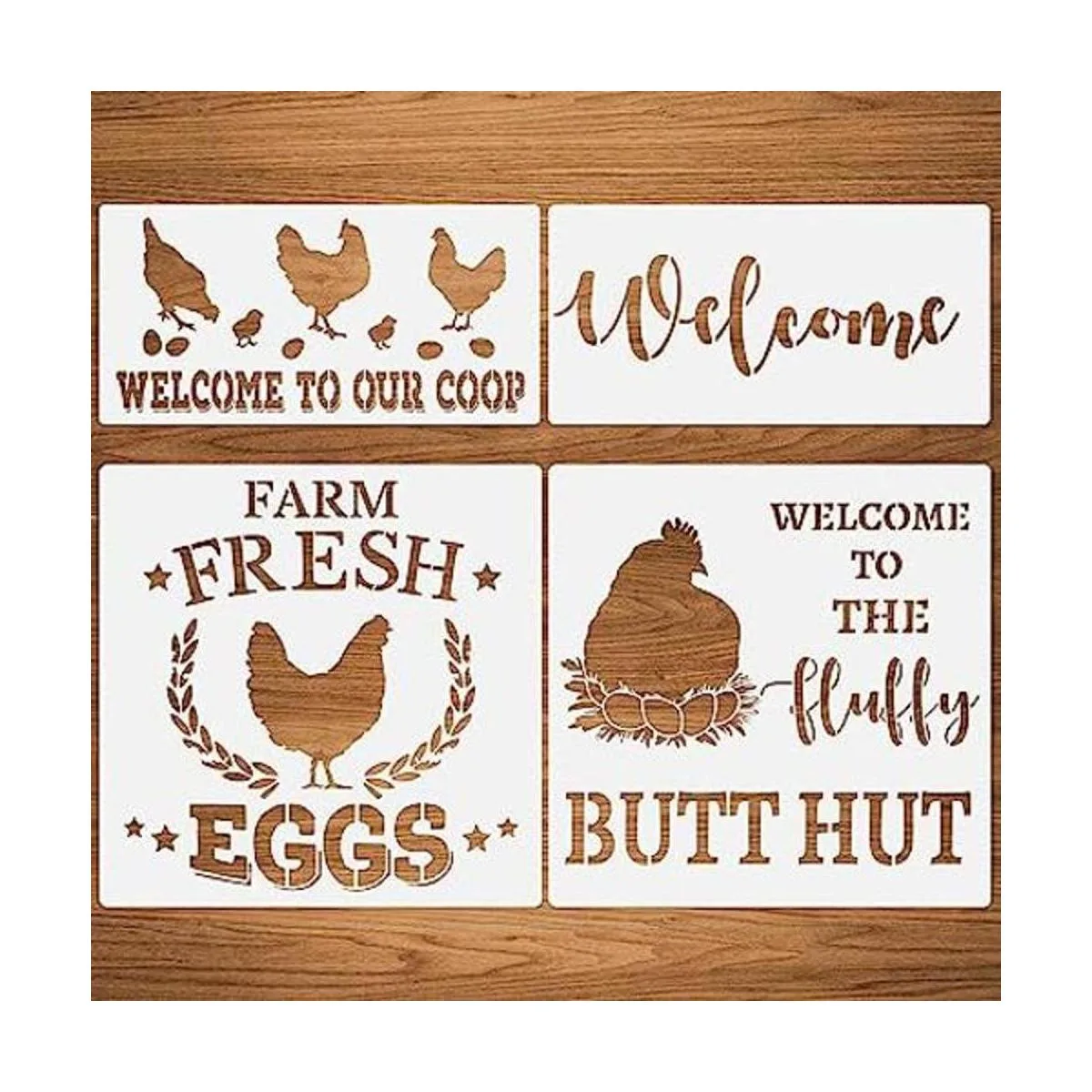 4 paquetes de plantillas de gallina 2 huevos frescos de granja y plantilla de letras de bienvenida a la cabaña esponjosa 12 x 12 pulgadas, 2 plantillas de bienvenida a nuestro gallinero y bienvenida 6 x 12 pulgadas.