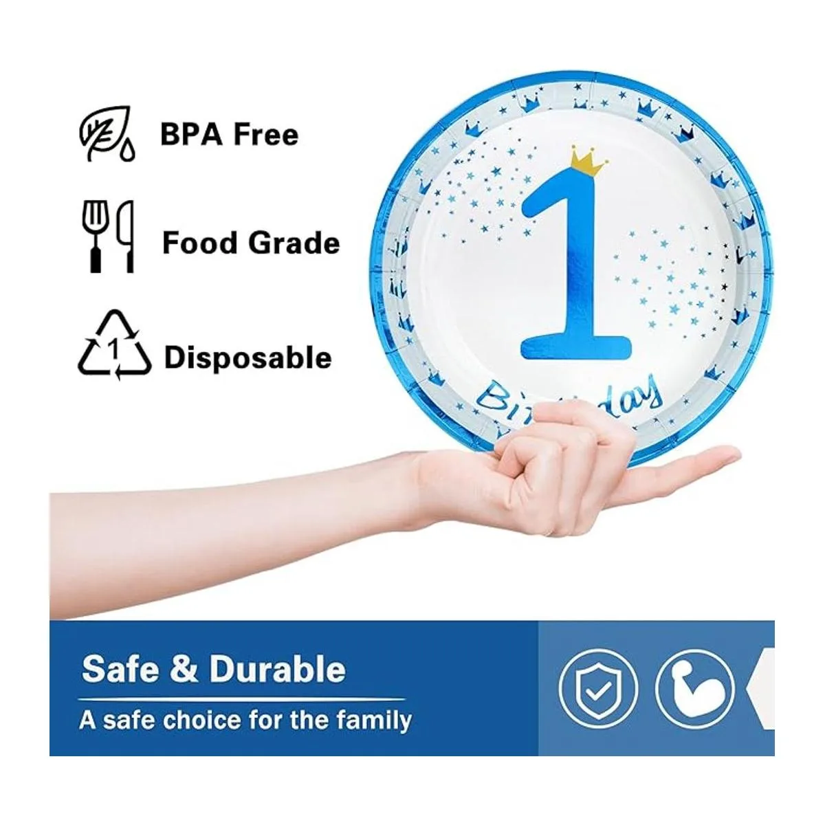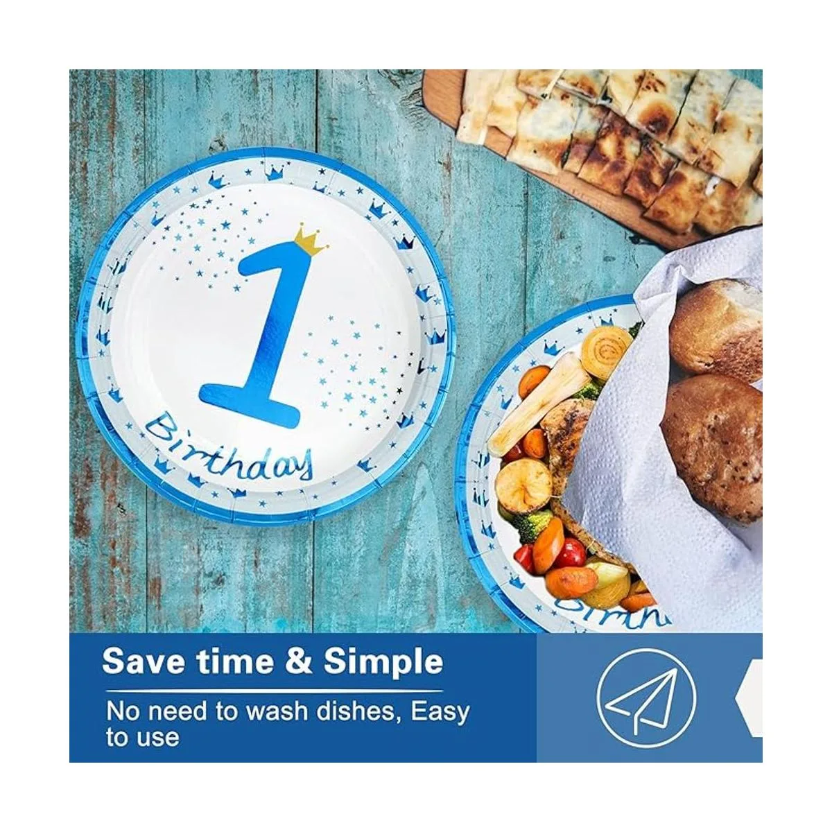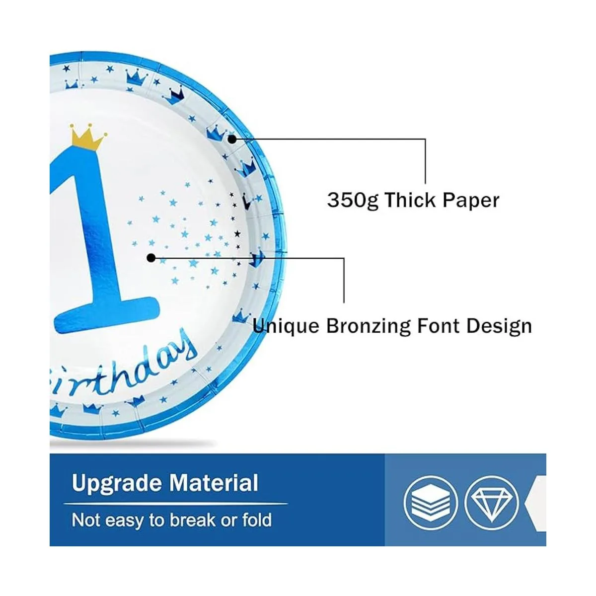 Suministros de fiesta de primer cumpleaños: diseñamos esta vajilla de primer cumpleaños con un brillante y elegante impreso en el medio de los platos, y le dimos una hermosa corona, rodeada de coronas azules y estrellas para embellecer, lo que significa que el día del primer cumpleaños u otras fiestas de aniversario, nuestro bebé será la estrella de la fiesta como un príncipe