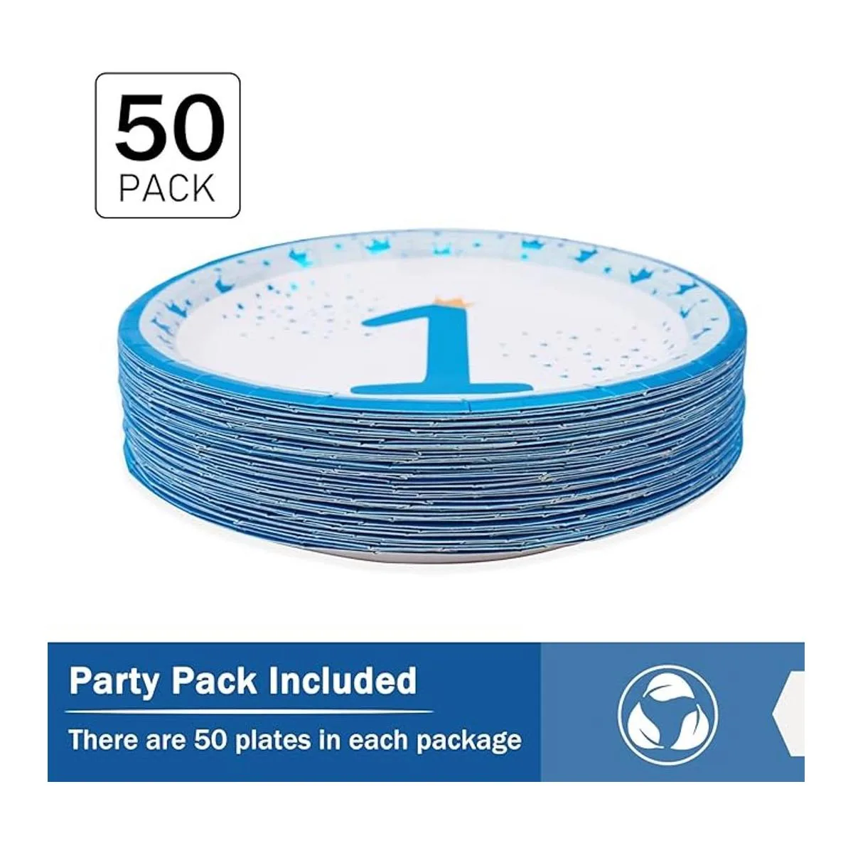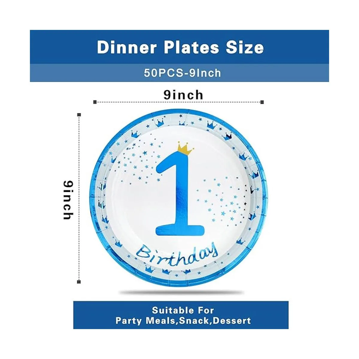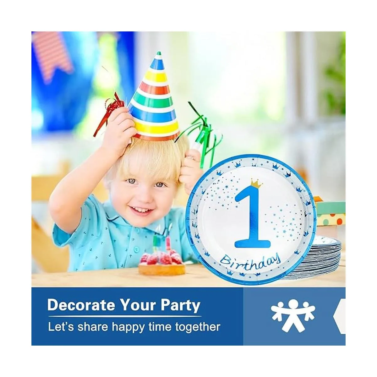 Suministros de fiesta de primer cumpleaños: diseñamos esta vajilla de primer cumpleaños con un brillante y elegante impreso en el medio de los platos, y le dimos una hermosa corona, rodeada de coronas azules y estrellas para embellecer, lo que significa que el día del primer cumpleaños u otras fiestas de aniversario, nuestro bebé será la estrella de la fiesta como un príncipe