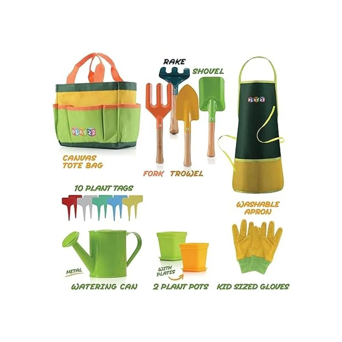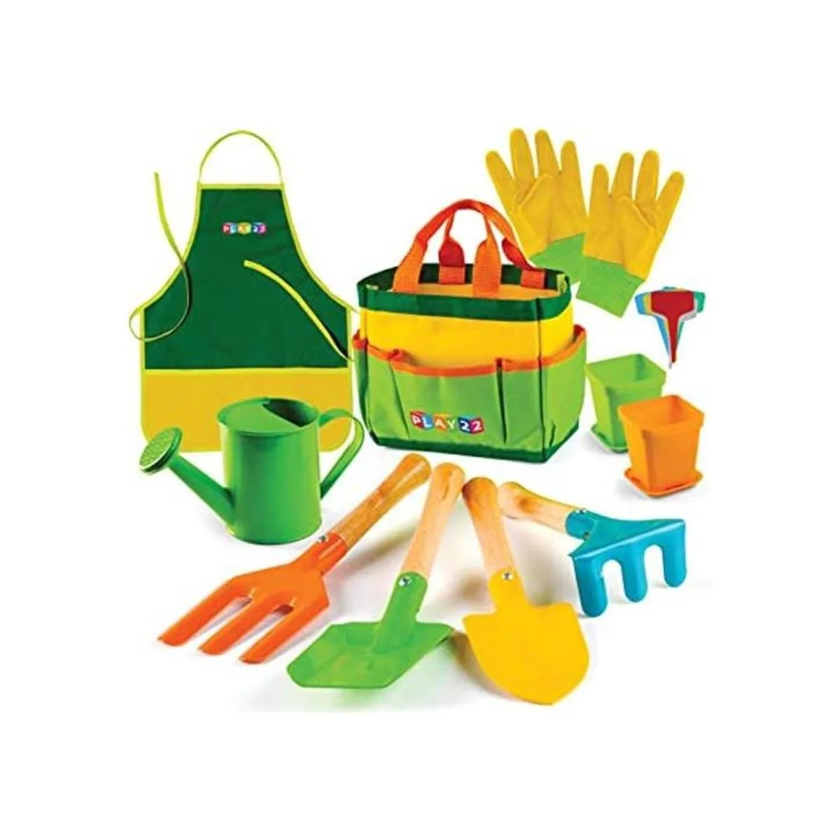 Play22 Juego de herramientas de jardinería para niños, 12 piezas, herramientas de jardinería para niños, pala, paleta de tenedor de rastrillo, delantal, guantes, regadera y bolsa de mano, herramientas de jardinería de madera para niños, mejores juguetes al aire libre, regalo para niños y niñas