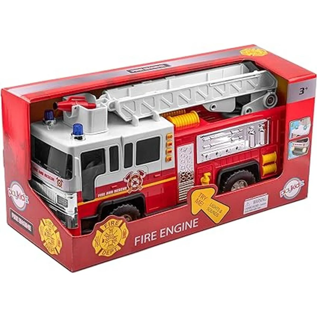 Playkidiz Juguete de camión de bomberos de 15 pulgadas para niños con luces y sonidos de sirena, vehículo clásico de emergencia con ruedas rojas y blancas, escalera móvil de juego interactivo, diversión de aprendizaje temprano, niños o niñas