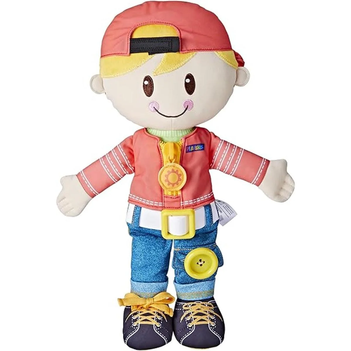 Playskool Dressy Kids Muñeca con cabello rubio y sombrero, juguete de peluche de actividad con cremallera, encaje de zapatos, botón, para niños de 2 años en adelante exclusivo de Amazon