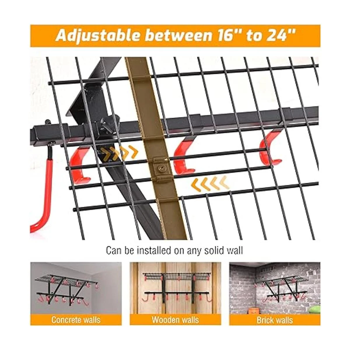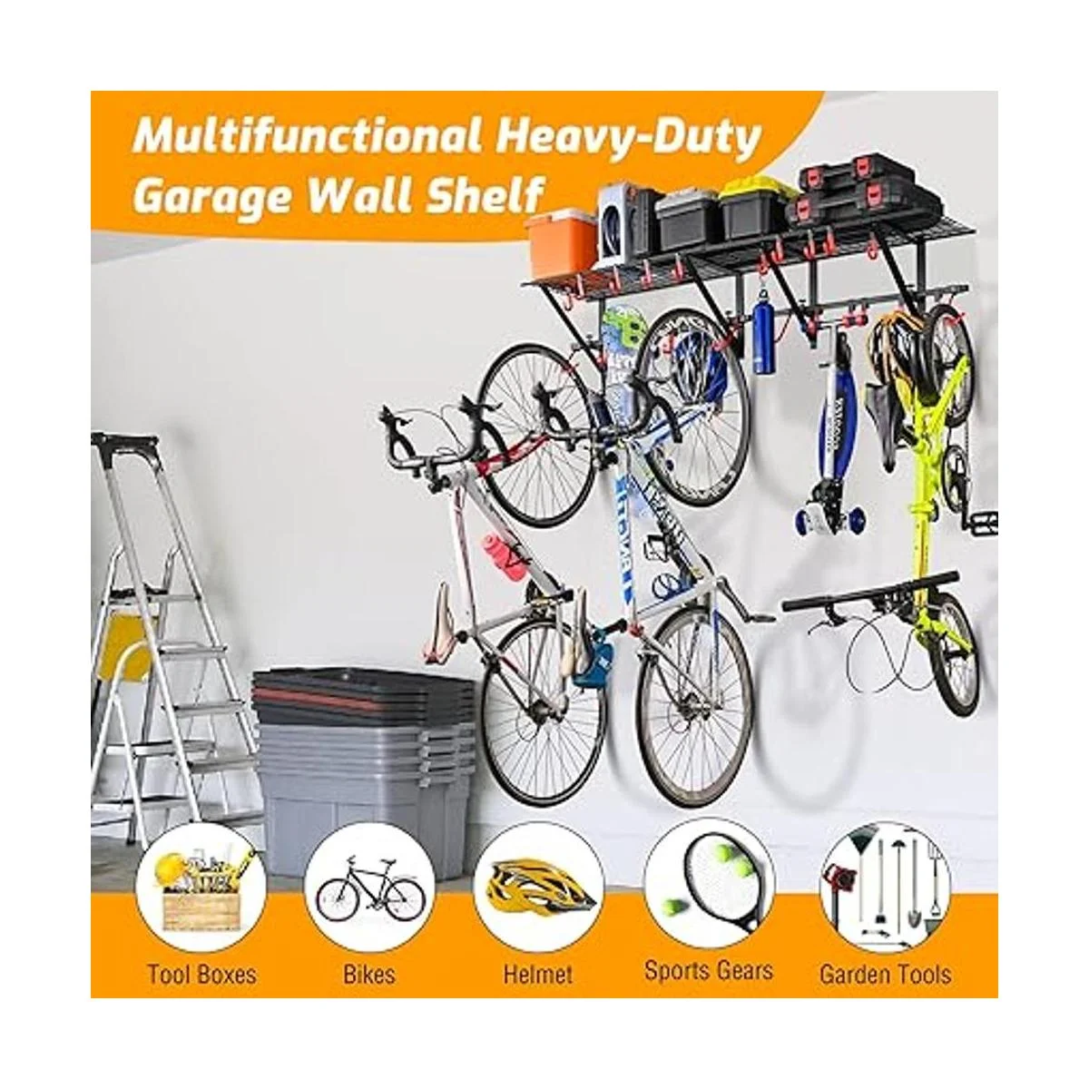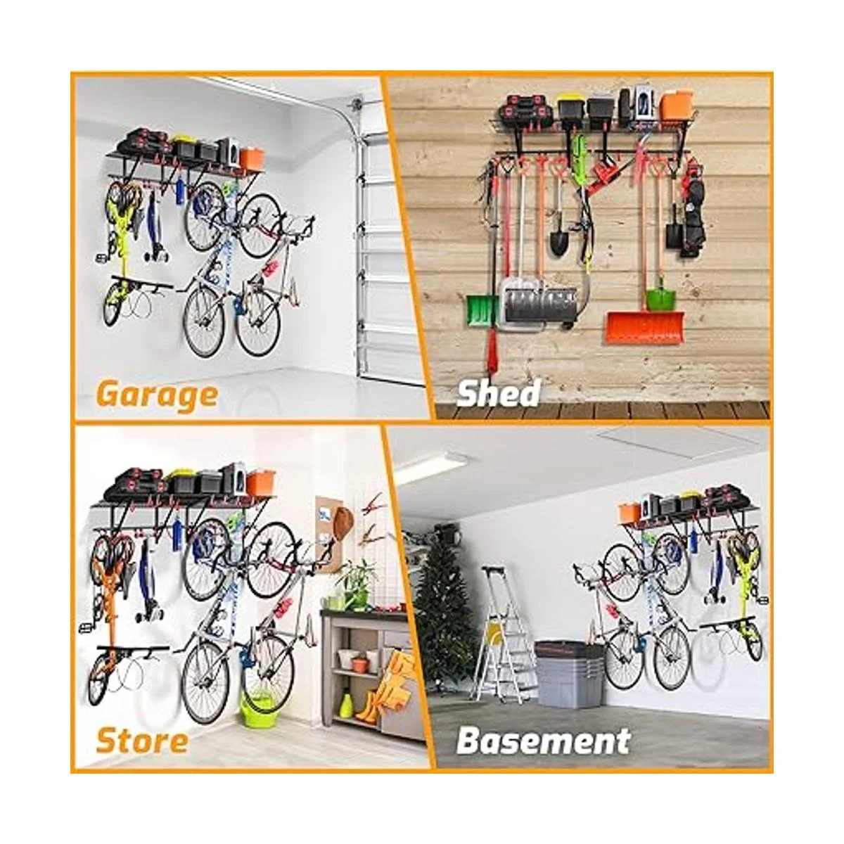 Estantería de pared multifuncional para garaje: con ganchos de almacenamiento y estante de almacenamiento de pared superior, es perfecto para sostener bicicletas, cajas de herramientas, equipos deportivos, abrigos y más equipos al mismo tiempo.