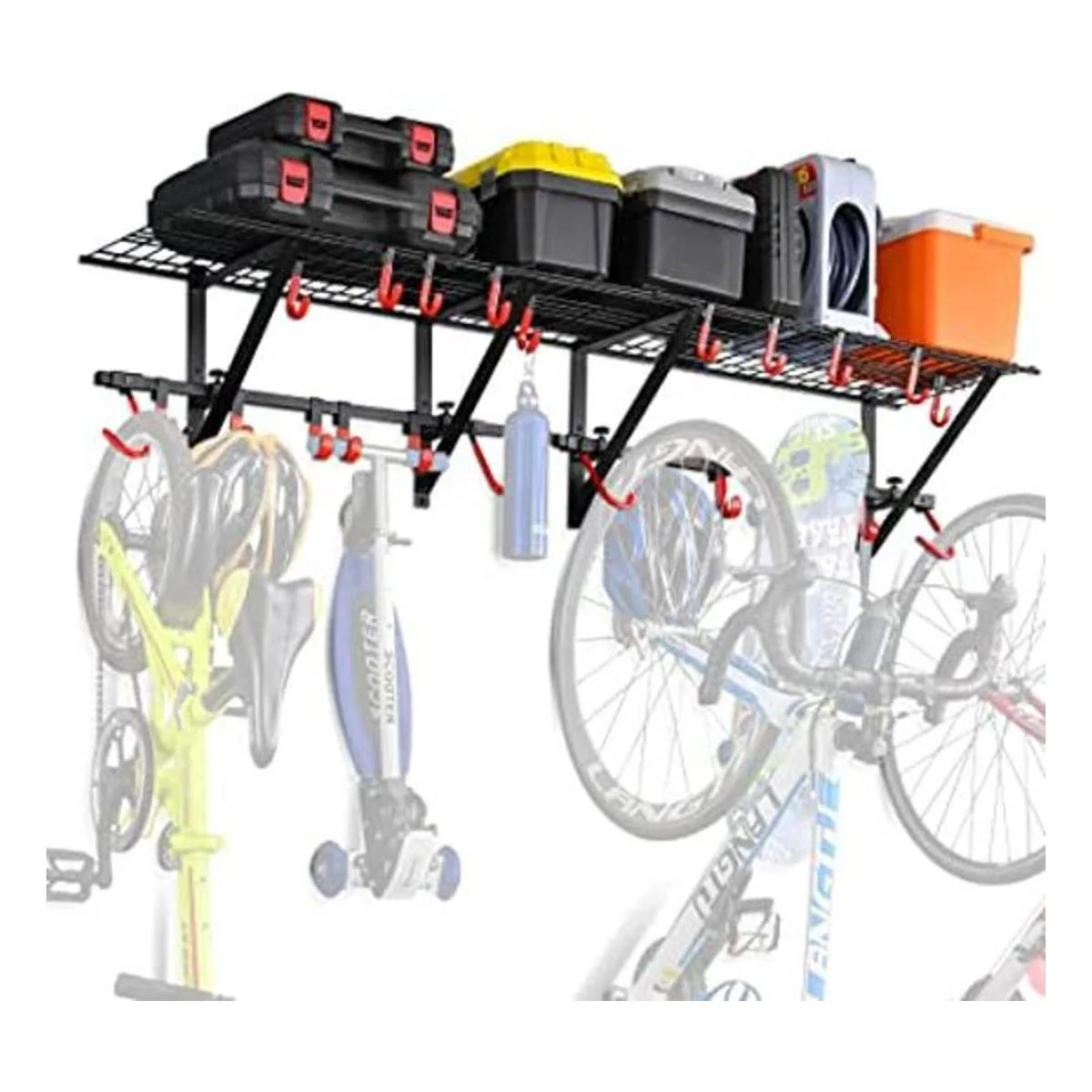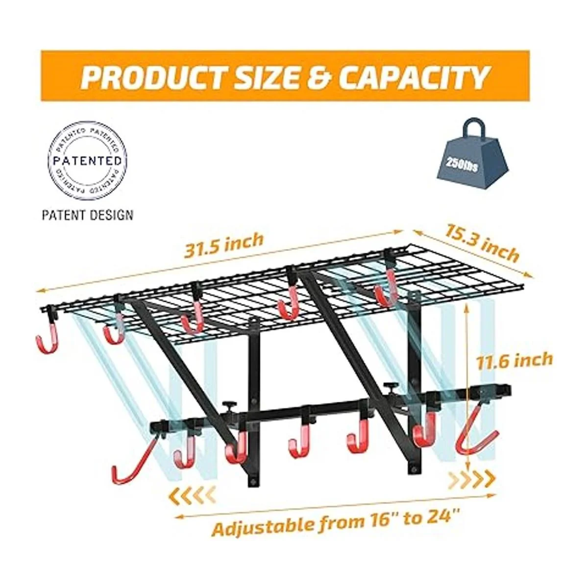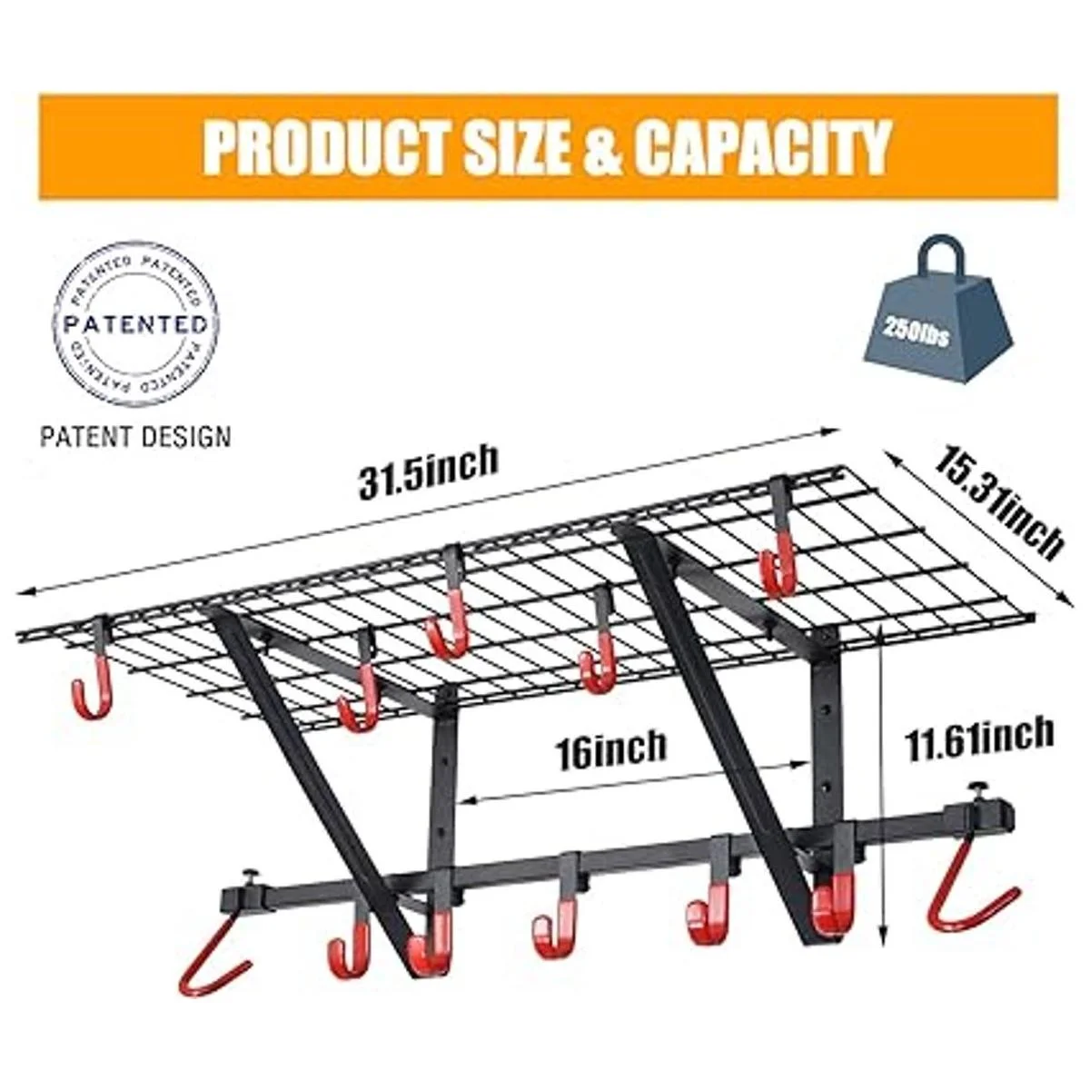 Estantería de pared multifuncional para garaje: con ganchos de almacenamiento y estante de almacenamiento de pared superior, es perfecto para sostener bicicletas, cajas de herramientas, equipos deportivos, abrigos y más equipos al mismo tiempo.