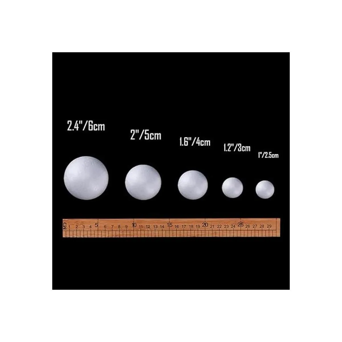 Tamaño: 5 tamaños de esferas de poliestireno macizo, diámetro de aproximadamente 2.5 cm 1 pulgadas, 3 cm 1.2 pulgadas, 4 cm 1.6 pulgadas, 5 cm 2 pulgadas, y 6 cm 2.4 pulgadas, todo se adapta a tus diferentes necesidades.