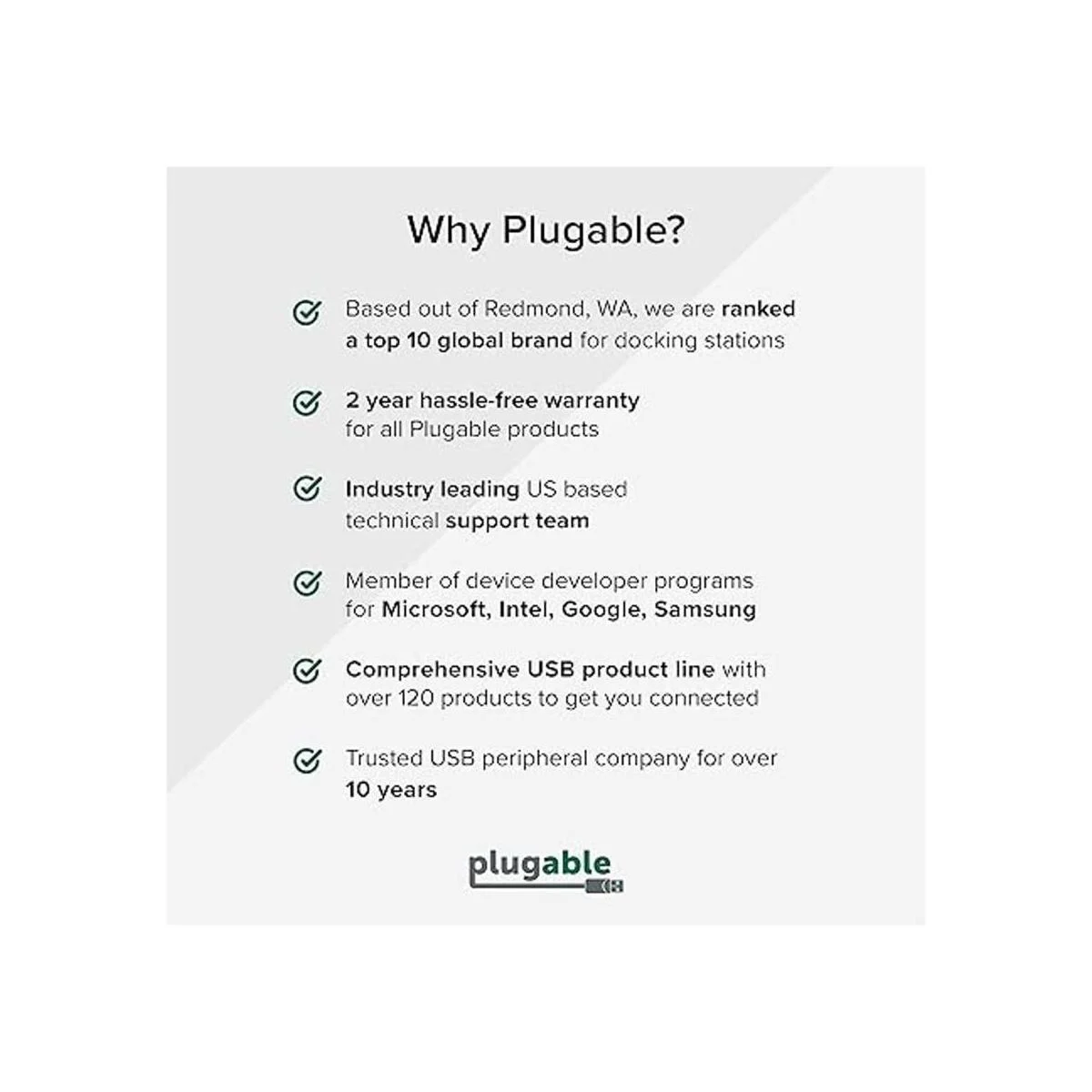 Nos encantan nuestros productos Plugable, y esperamos que tú también. Todos nuestros productos están respaldados con una garantía limitada de 2 años de piezas y mano de obra, así como soporte de correo electrónico basado en Seattle