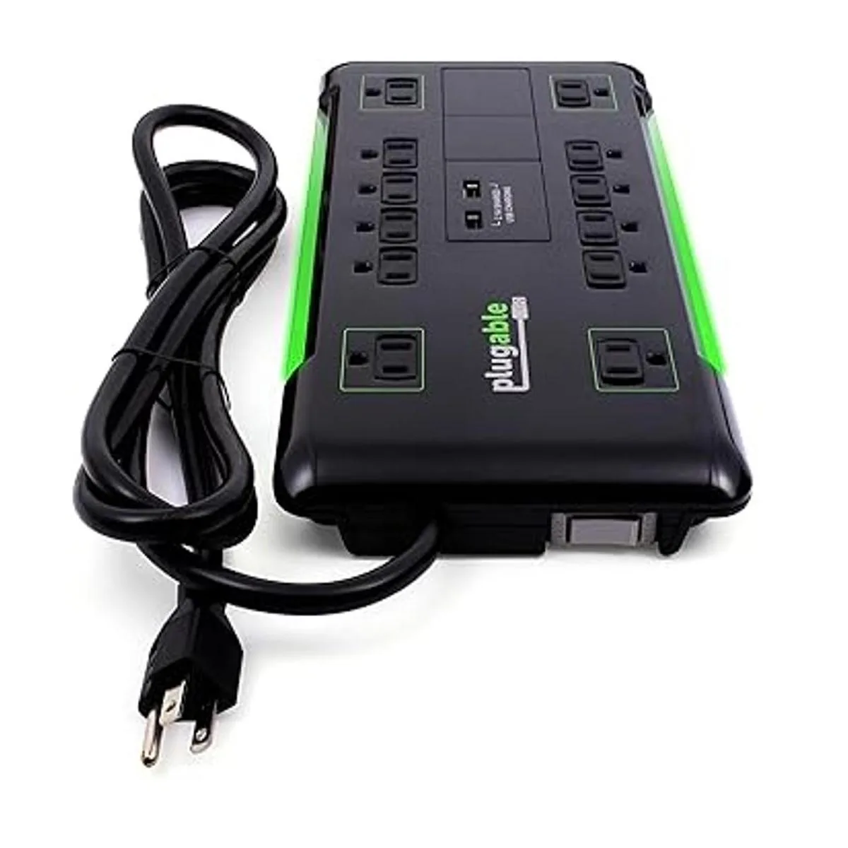 Plugable Regleta protectora contra sobretensiones con USB y 12 salidas de CA, cargador USB de 2 puertos integrado de 10.5 W para dispositivos móviles Android, Apple iOS y Windows, cable de extensión de 6 pies