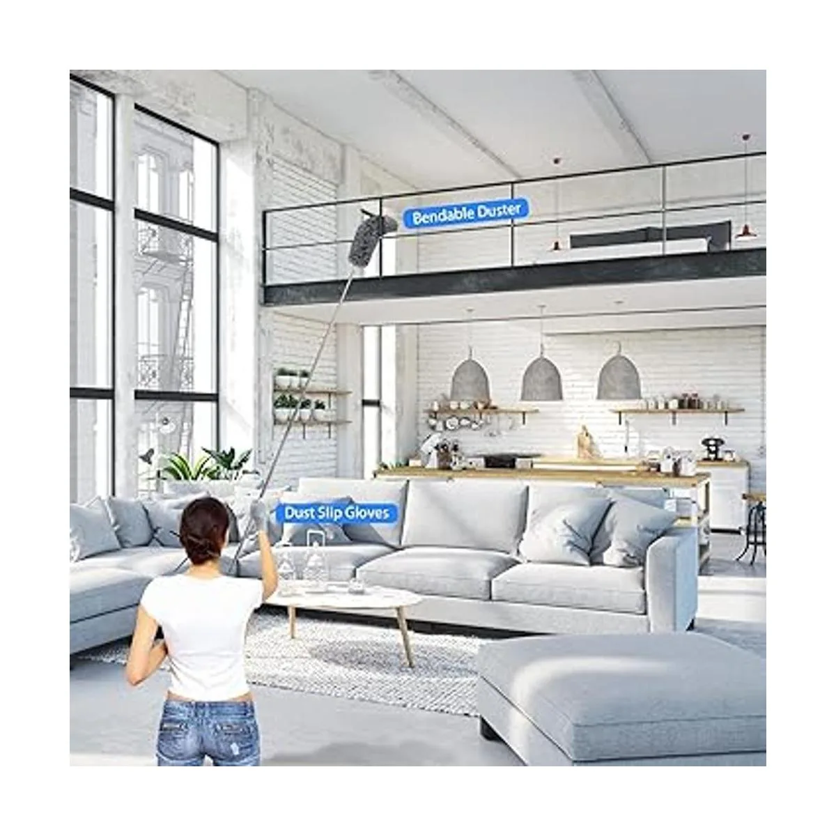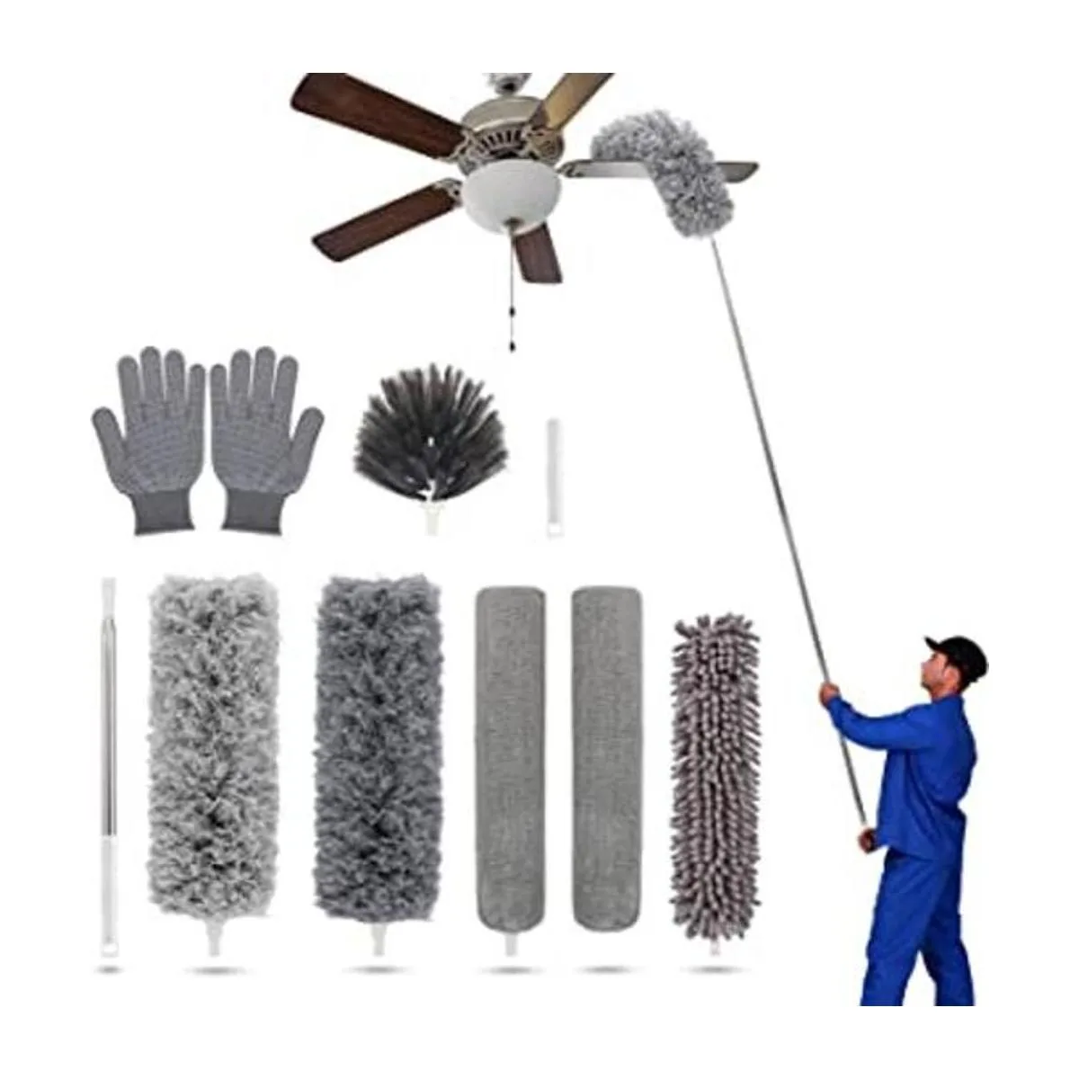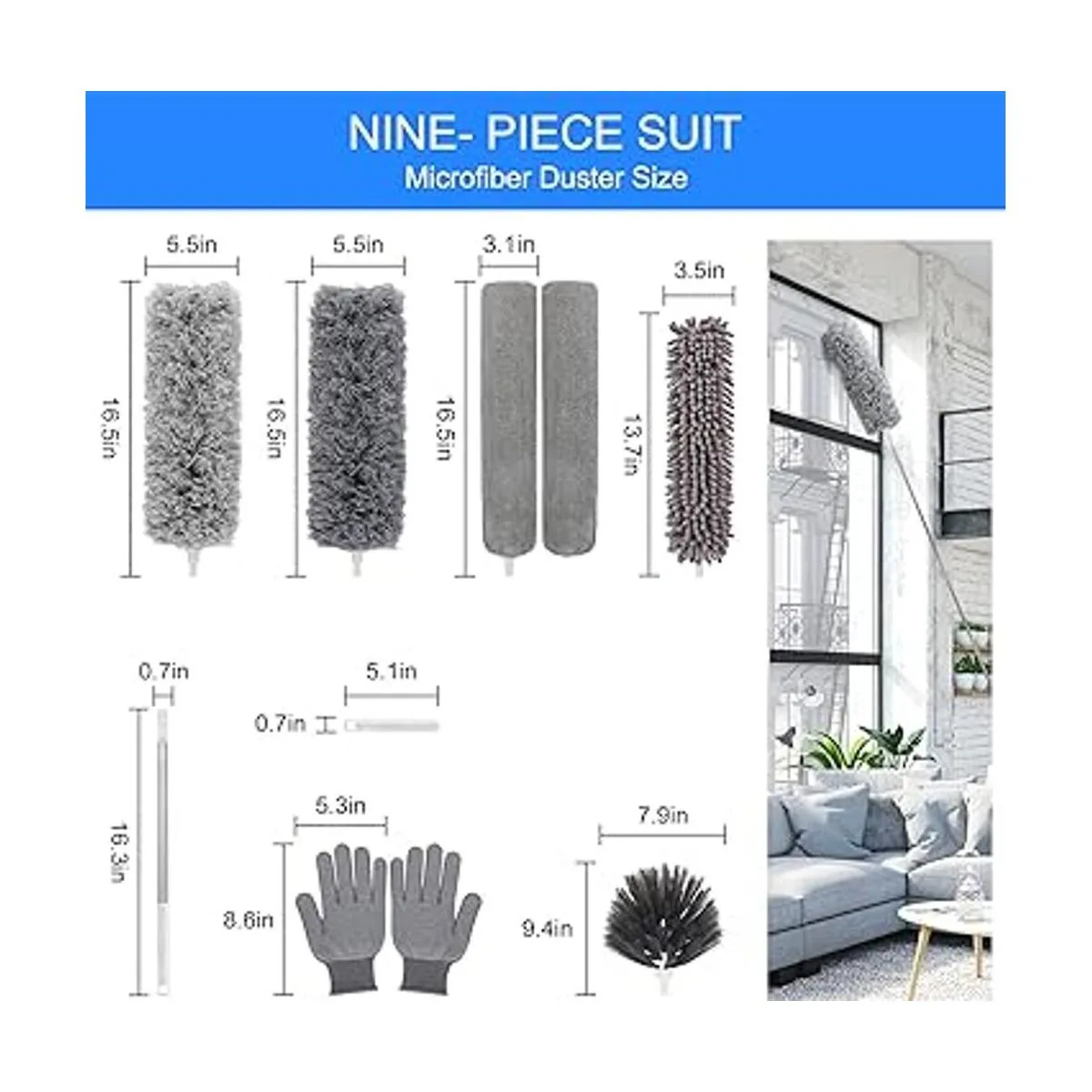 Kit de plumero de 9 piezas Los plumeros de plumas para limpieza tienen un poste telescópico de 6.6 ft, 5 cabezales intercambiables 2 cabezales de microfibra flexibles, 1 cabezal de plumero de chenilla flexible, 1 cabezal de plumero de telaraña y 1 cepillo para grietas y un mango corto de 5 pulgadas, otro cepillo para grietas y un par de guantes grises. Perfecto para limpiar cualquier pequeña partícula en rincones, grietas, paredes, ventiladores, techos altos, estanterías, etc.