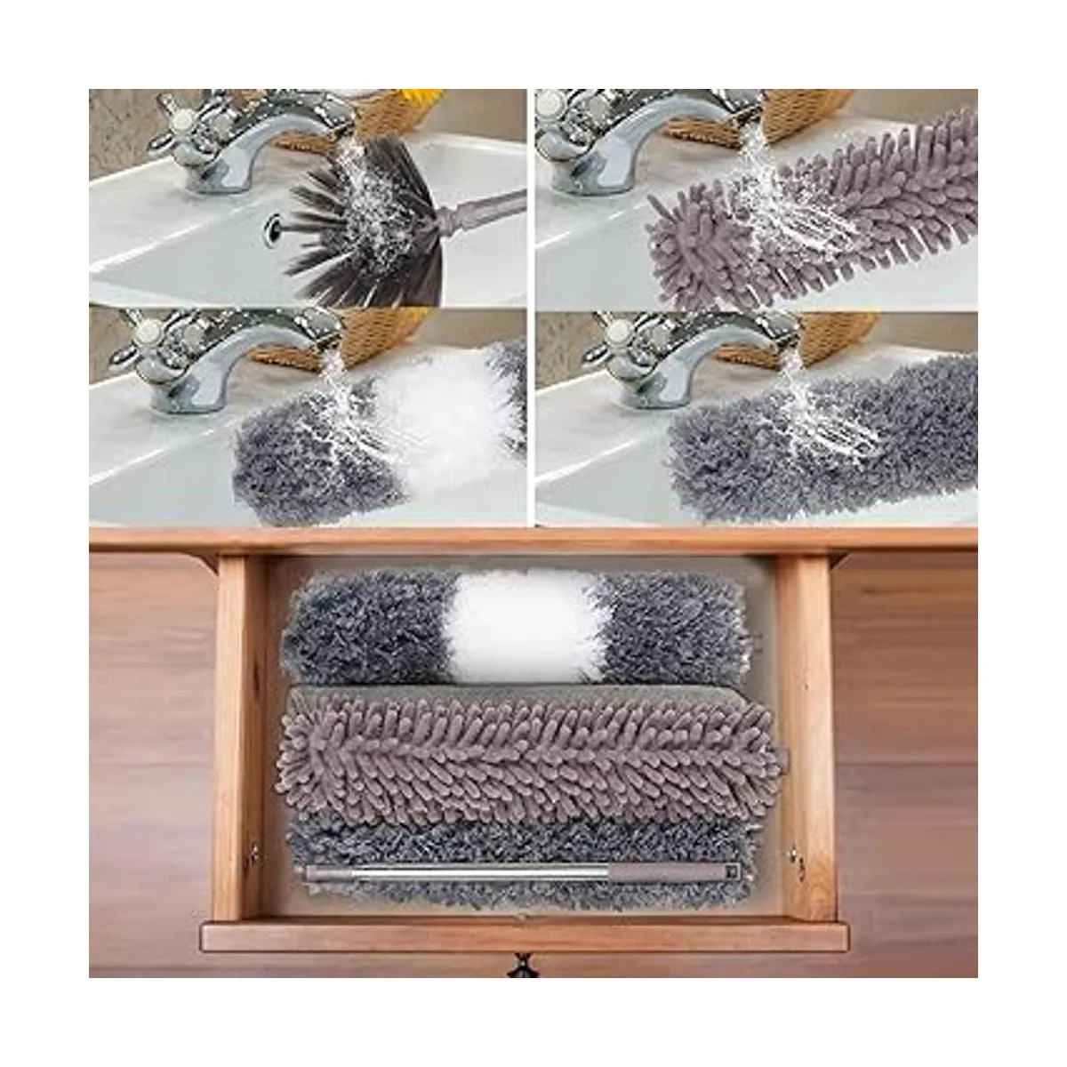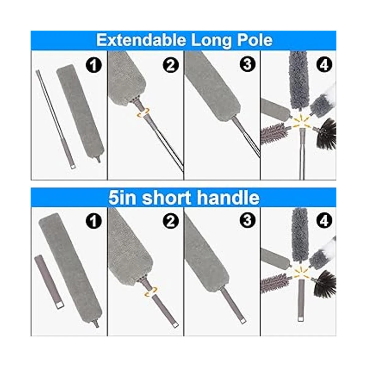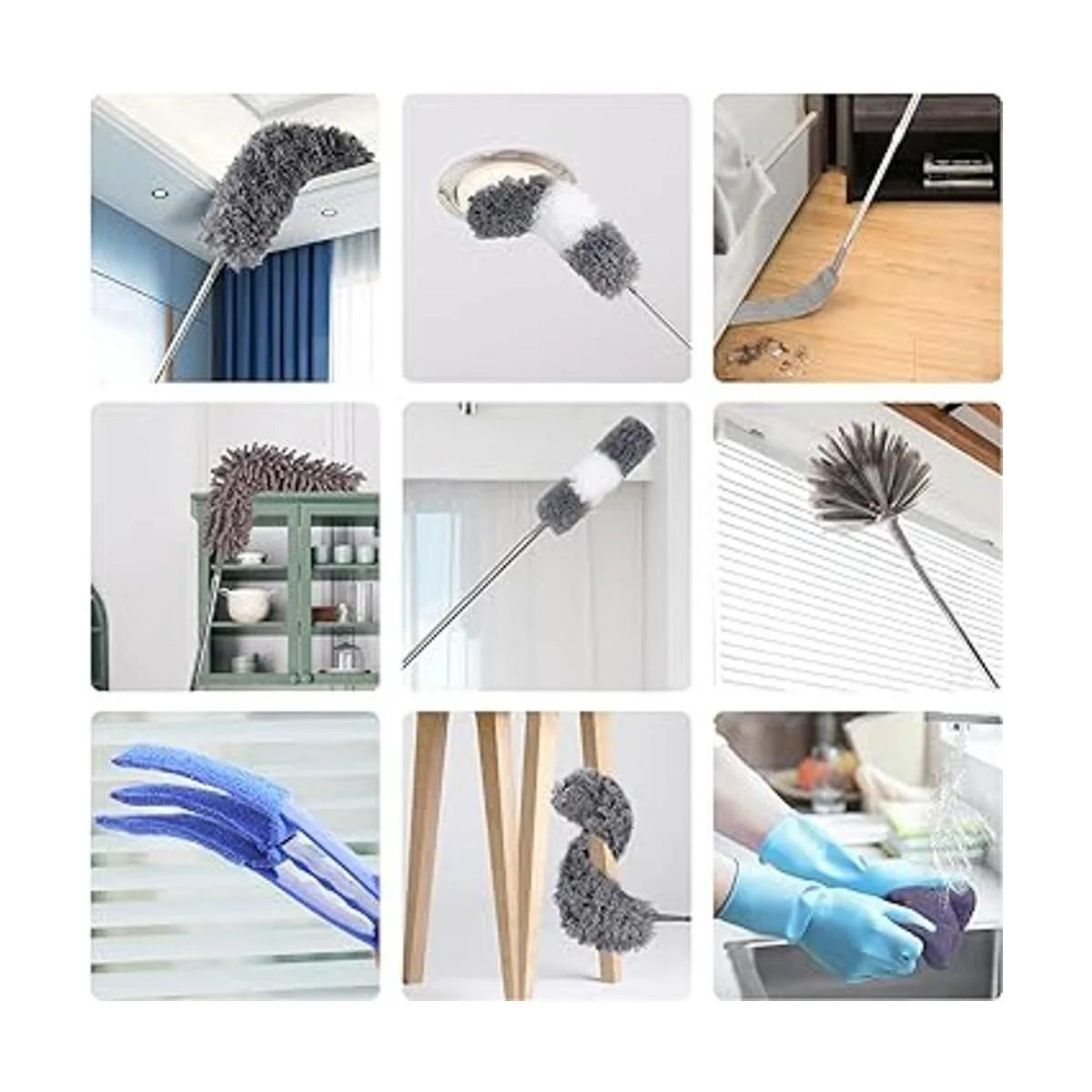 Kit de 11 plumeros actualizado 2022: este nuevo kit de limpieza del hogar incluye 1 poste telescópico de 6.6 ft hasta 100 pulgadas, 2 cabezales de microfibra flexibles, 1 cabezal de felpilla flexible, 1 cabezal de plumero de telaraña, 1 cepillo de limpieza de grietas, 1 paño de polvo de cepillo plano, 1 mango corto de 5 pulgadas 5 cabezales intercambiables. 2 guante, 1 ventana. Limpieza ciega y 1 paño de limpieza gris. que puede ayudarte a limpiar rápida y fácilmente el polvo en la superficie o huecos de objetos, cree que este súper kit removedor de polvo te impresionará.