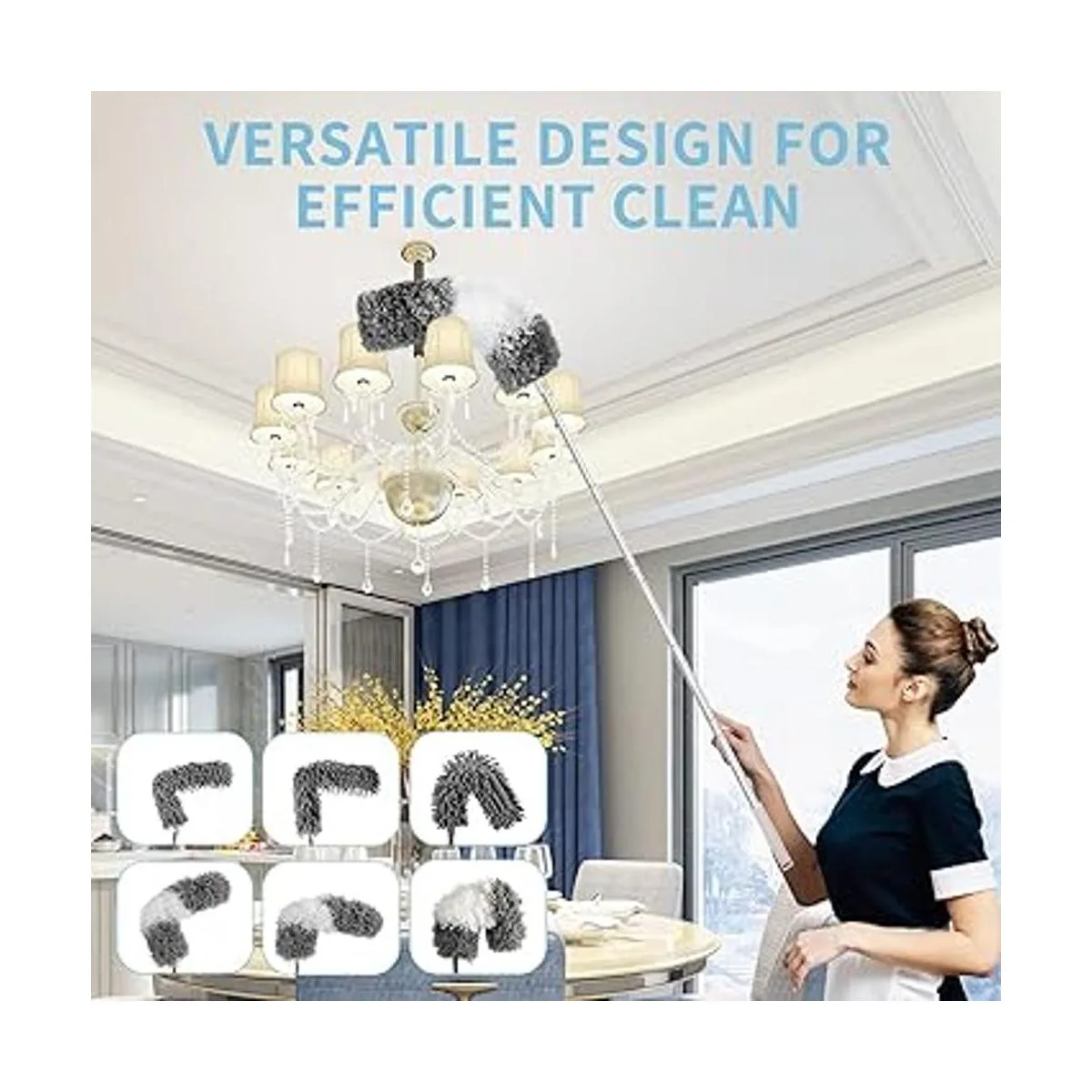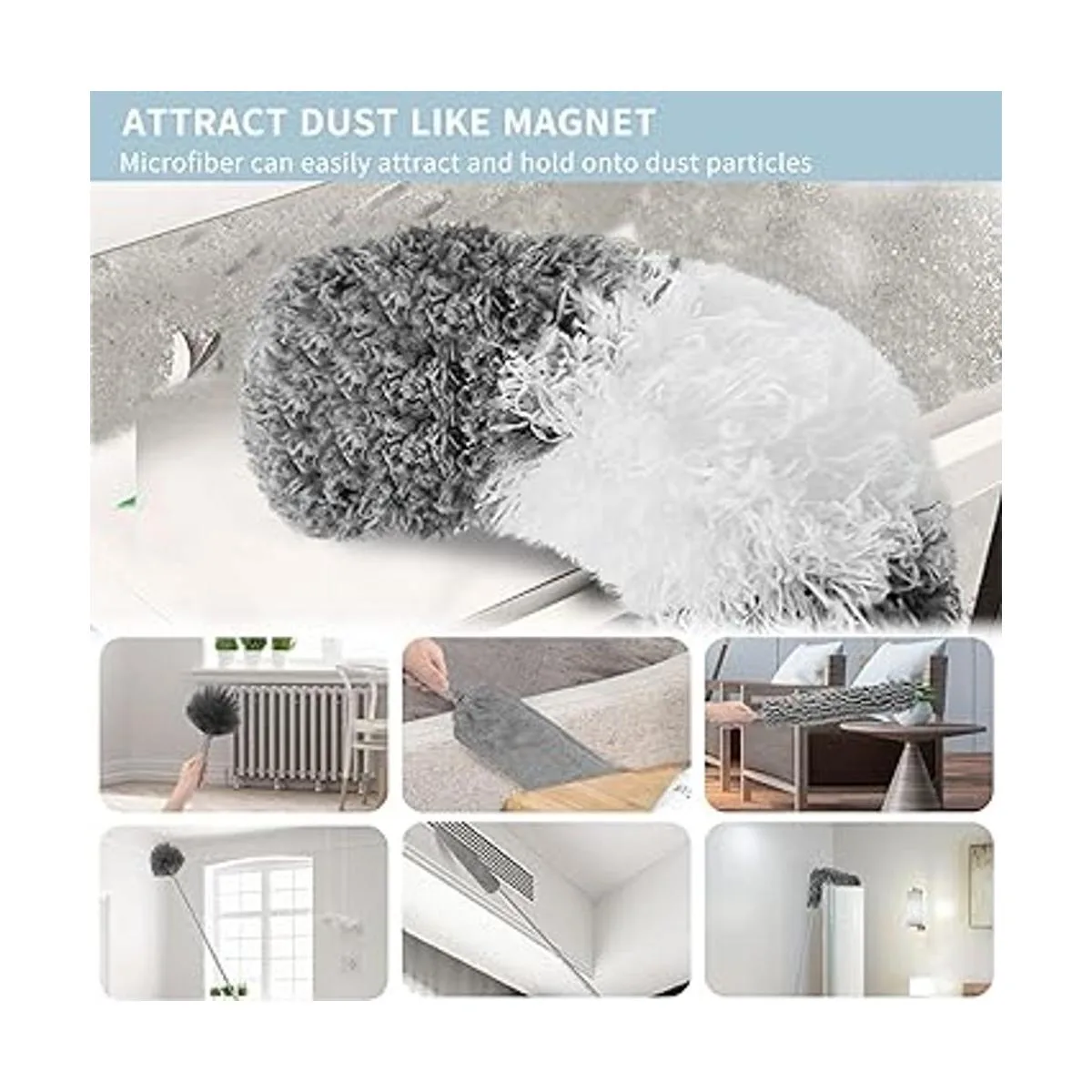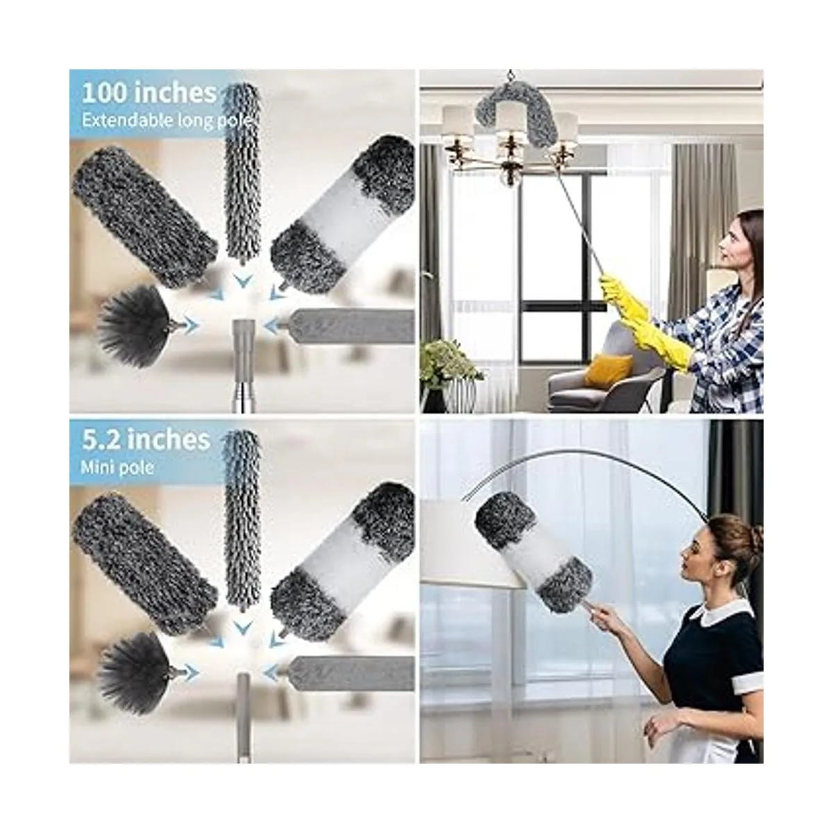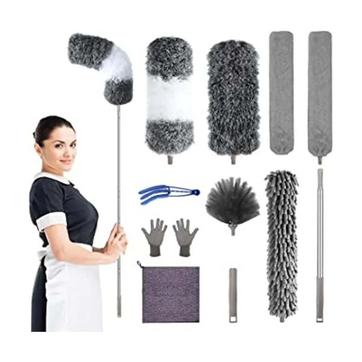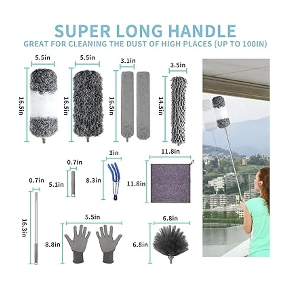 Kit de 11 plumeros mejorado: este kit de limpieza multifunción incluye un poste largo extensible y un mini poste, 2 cabezales de microfibra flexibles, 1 cabezal de plumero de chenilla, 1 cepillo para grietas, 2 paños planos, 1 cabezal de plumero de telaraña, persianas, 1 par de guantes grises. Reemplazar diferentes tipos de cabezales de cepillo que pueden permitirte limpiar fácilmente cualquier lugar, contiene todo lo que necesitas para limpiar tu hogar desde el suelo hasta el techo, manteniendo tu hogar lejos del polvo.