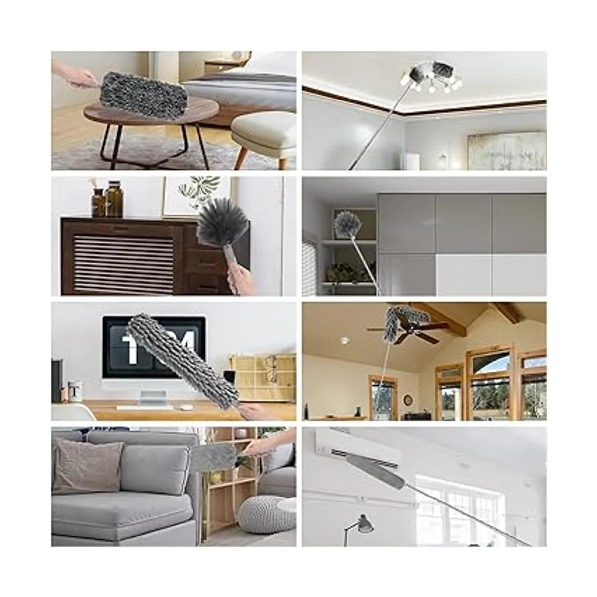 Poste largo extensible de acero inoxidable: nuestro plumero extensible tiene la capacidad de extenderse hasta 100 pulgadas, este juego de plumero y poste de extensión está diseñado para alcanzar y limpiar fácilmente todo tipo de ángulos extraños y superficies incómodas y con un mango corto que puede limpiar donde quieras en tu casa, ya sea un lugar alto o un lugar bajo.
