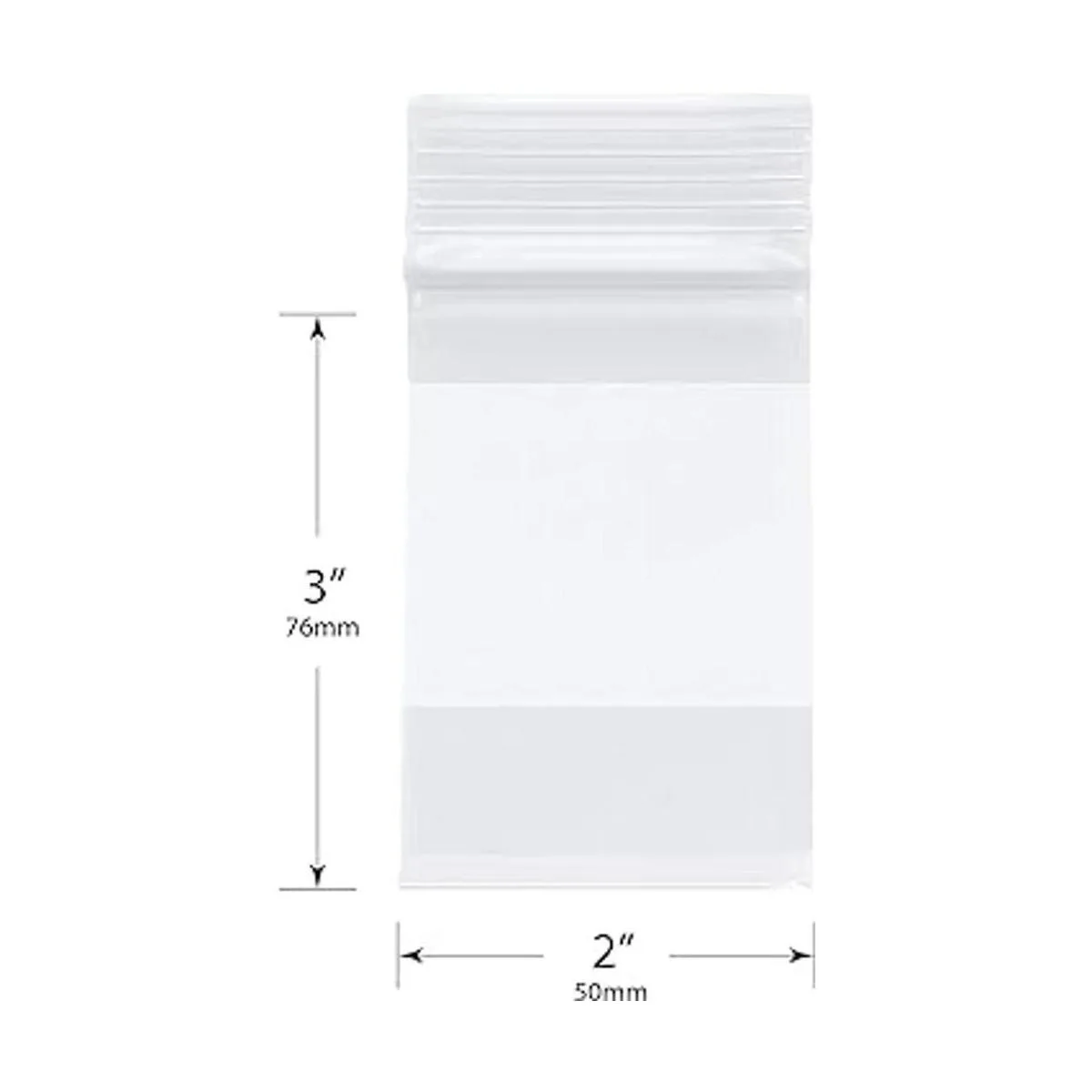 Tamaño y estilo de la bolsa: 2 pulgadas de ancho x 3 pulgadas de alto, debajo de la cremallera 1.969 in x 2.992 in, cuenta con bloque blanco para escribir