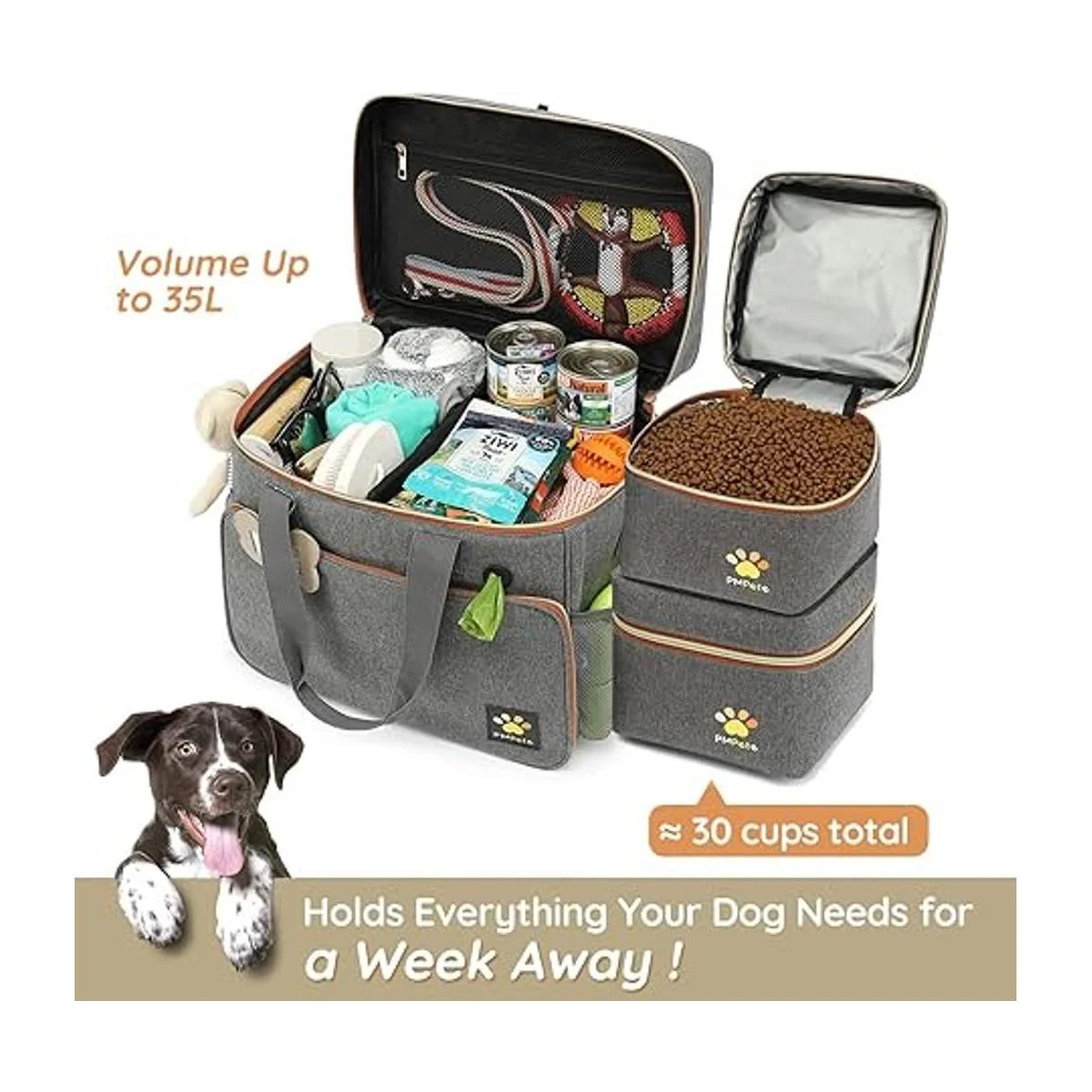 Compartimento interior grande y grueso: bolsa para perro de 35 L con un montón de bolsillos para suministros para perros: Tiene un compartimento principal con el divisor interno que se puede añadir o quitar según tus necesidades, la bolsa de alta capacidad Pmpete mantendrá todos los elementos esenciales para perros bien organizados y al alcance, como golosinas, alimentos, juguetes, manta, botella de agua para perros, correa/arnés, cuencos de comida y agua para perros, bolsas para residuos, etc.