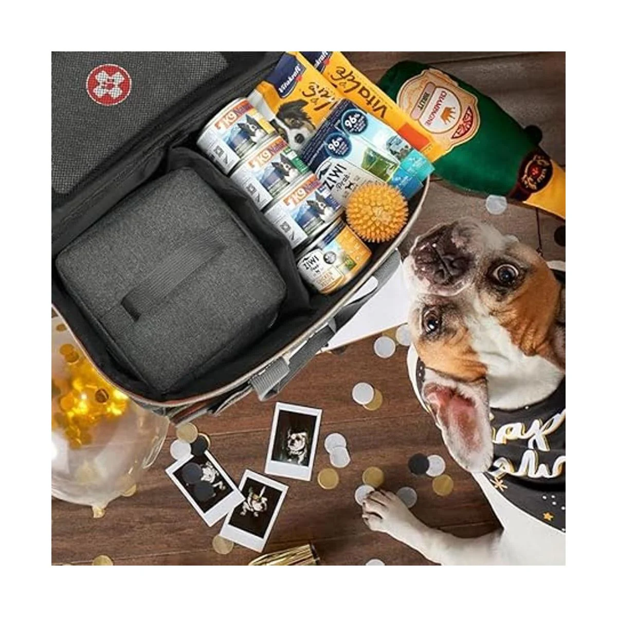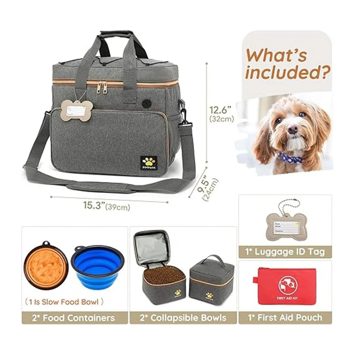Lo que obtendrás: 1 bolsa para perros, 2 bolsas para transportar alimentos para perros, 2 cuencos plegables de silicona para mascotas, 1 bolsa médica y 1 postal en forma de hueso con el nombre y número de contacto de tu perro. Las dimensiones de esta bolsa de viaje para perros son de 15.3 pulgadas de largo x 12.6 pulgadas de alto x 9.5 pulgadas de ancho, cumple con las aerolíneas y cabe debajo del asiento.
