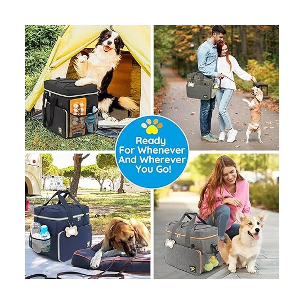 Diseño único Espacio de almacenamiento de gran capacidad, cremallera de alta calidad, correas de hombro ajustables y asa cómoda, contenedores de alimentos que son fáciles de limpiar, cordón elástico asegura la manta o alfombrilla de viaje, una etiqueta única para perro para evitar pérdidas accidentales, múltiples bolsillos y división extraíble. Diseño todo en uno para almacenar, organizar y alimentar.