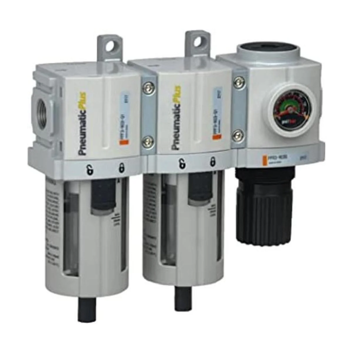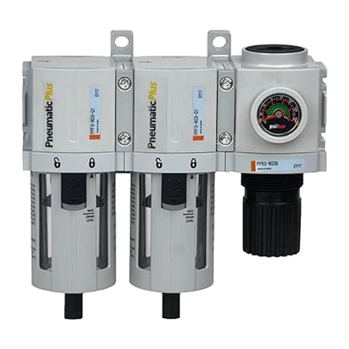 PneumaticPlus PPC3CN03G Sistema de secado de aire de 3 etapas, filtro de aire de partículas, filtro de coalescencia y regulador de presión de aire combinado de 38 pulgadas NPT, cuenco de polietileno, drenaje manual, calibre incrustado