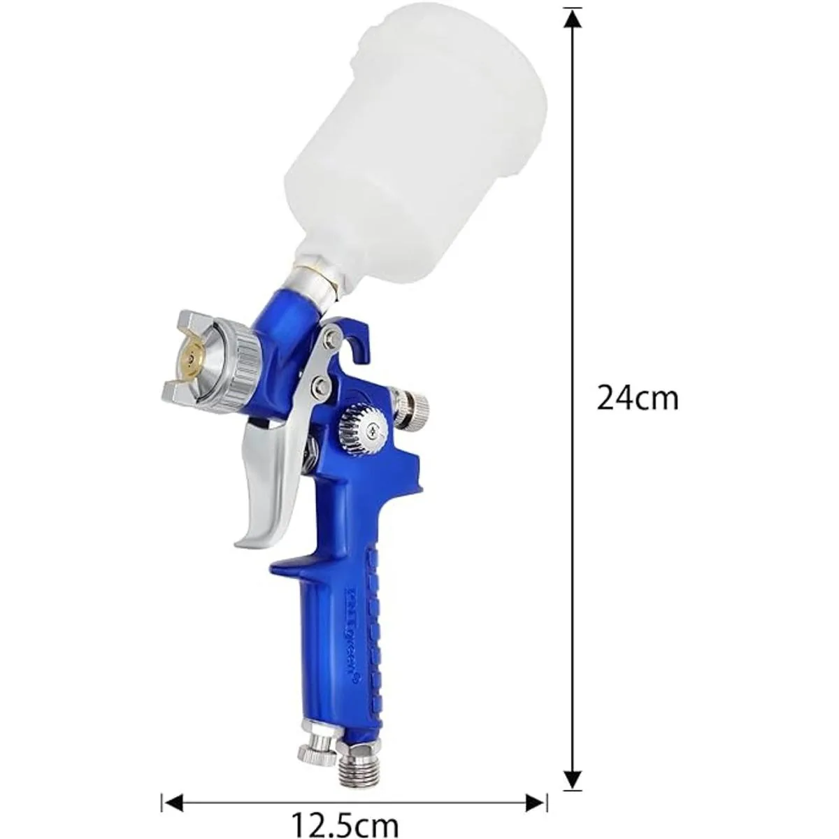 Especificaciones: Tipo de alimentación: gravedad / boquilla de fluido: 0.031 in / presión de aire: 3 bares 43 PSI / consumo de aire: 9 cfm / capacidad de pintura: 125 CC / entrada de aire: 1/4 pulgadas