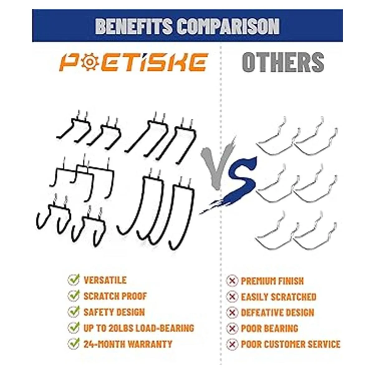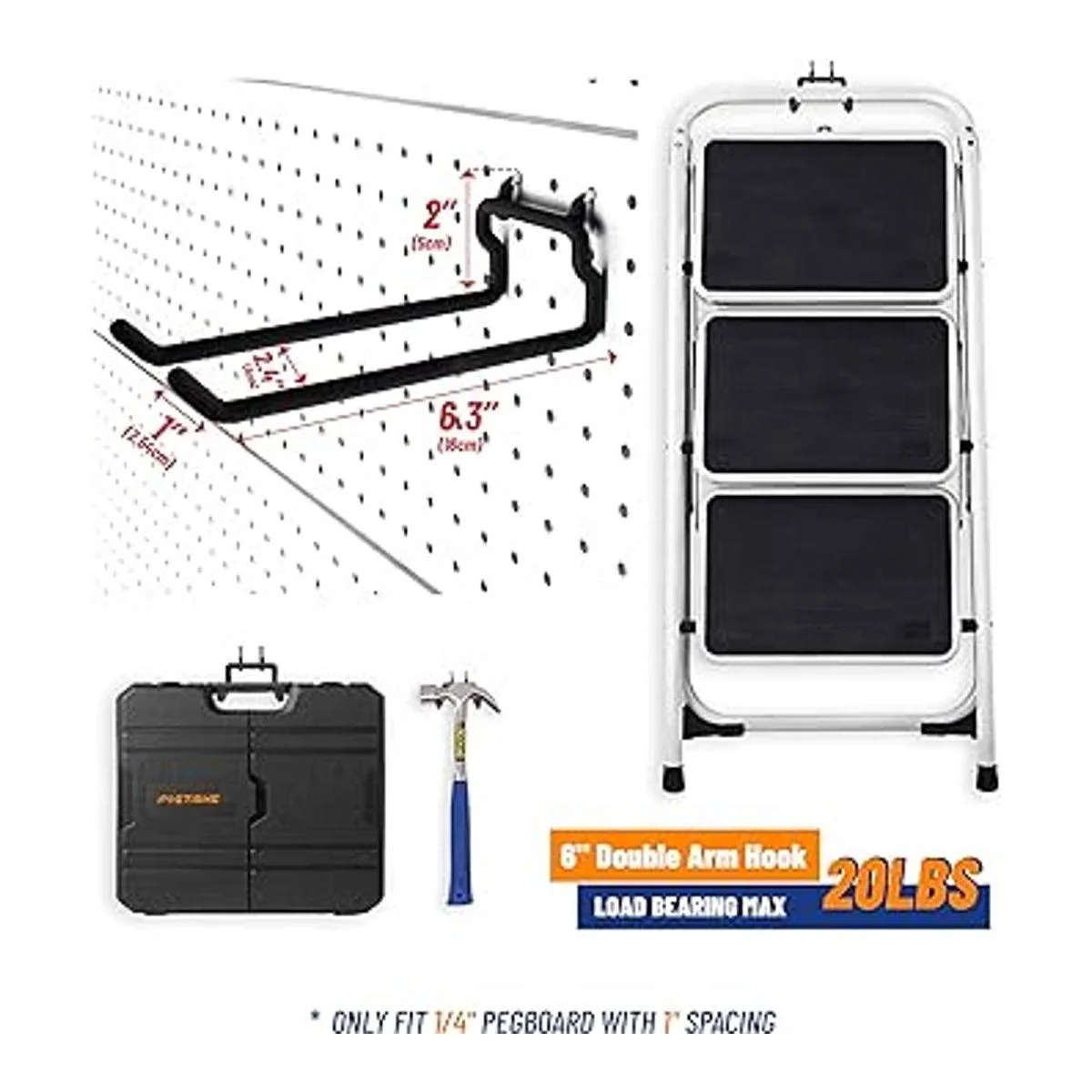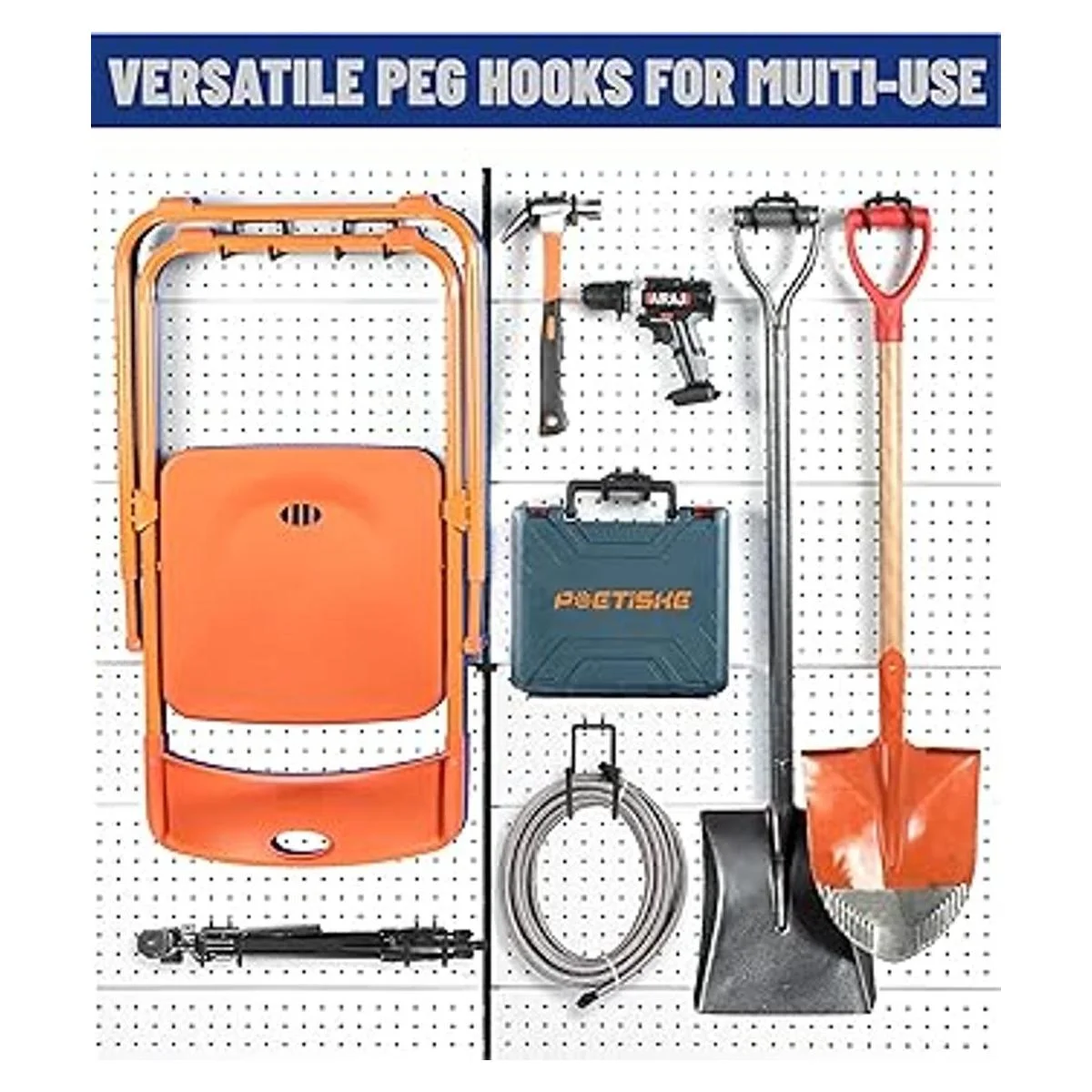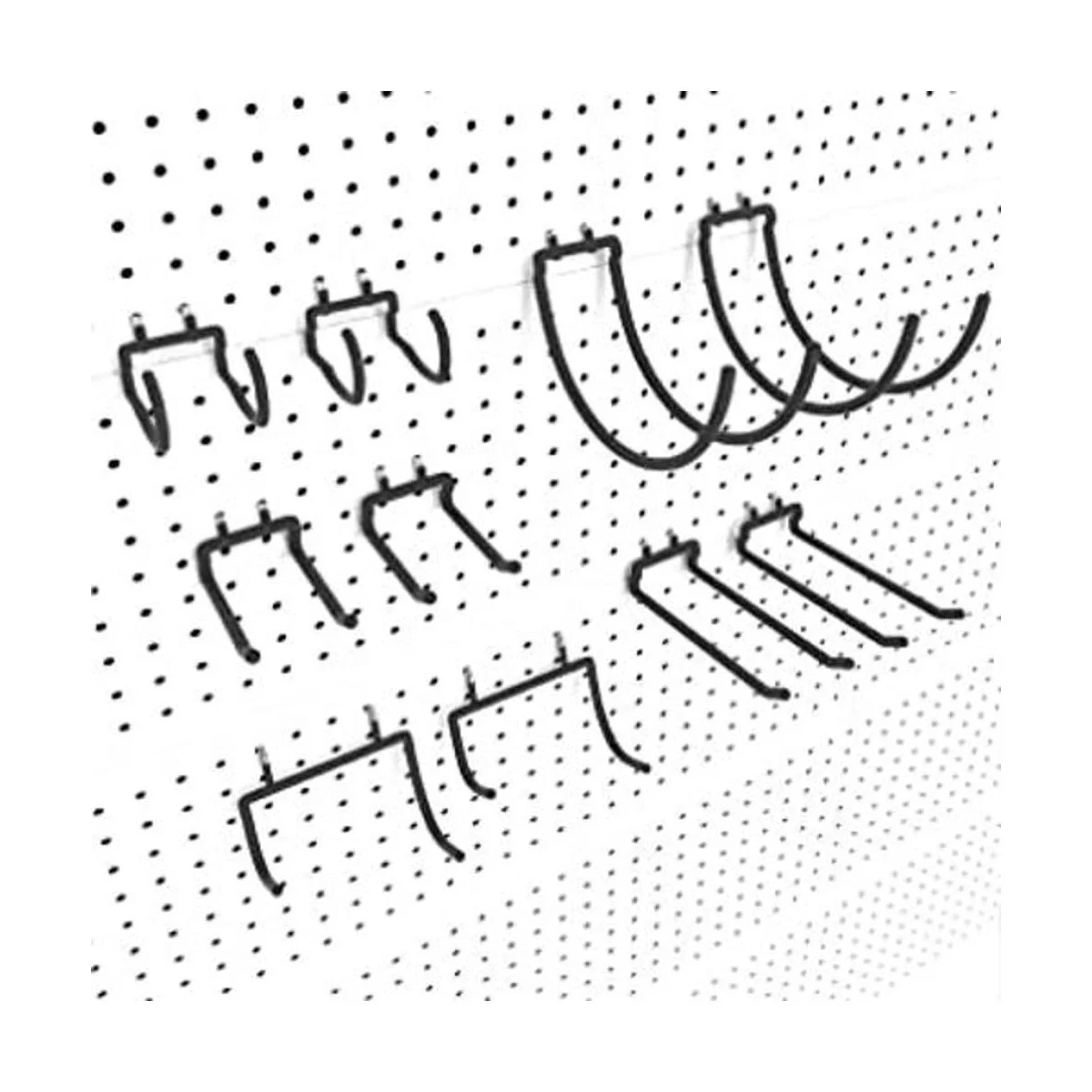 Calidad prémium: nuestros ganchos para herramientas de tablero de clavijas están hechos de acero de alta calidad que evita que se deforme, y el acabado recubierto de vinilo protege tus objetos valiosos. Cada gancho puede soportar hasta 20 libras.