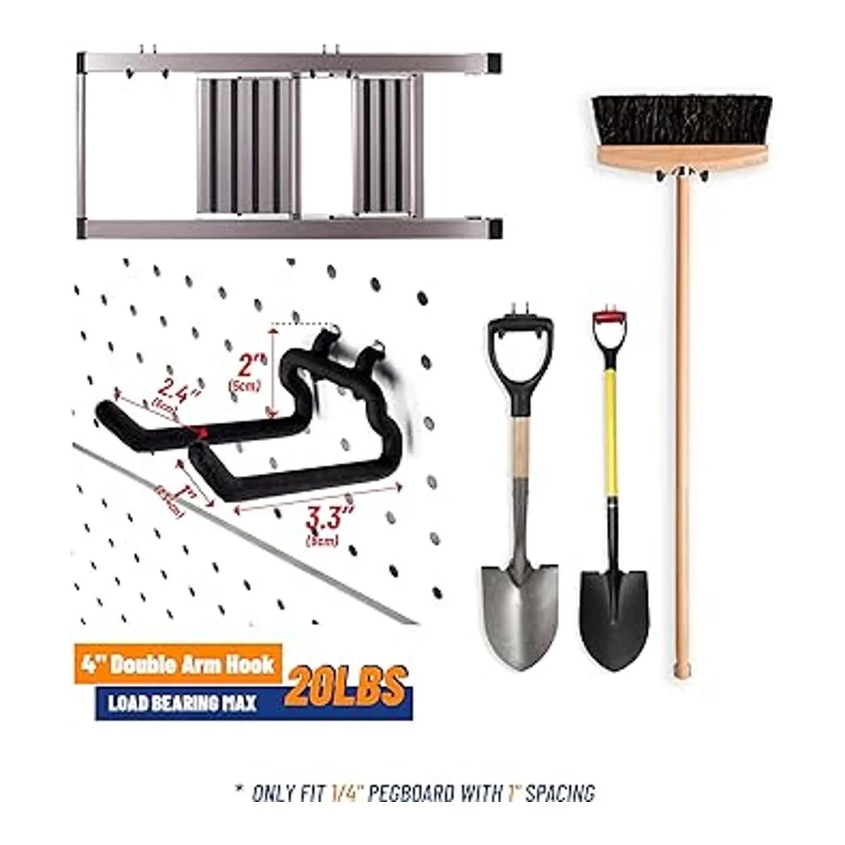 Versatilidad: nuestros 5 tipos de ganchos de pared para tableros de clavijas pueden colgar la mayoría de los artículos en tu garaje, cobertizo y patio. El soporte para herramientas eléctricas puede sostener tu cable o taladro inalámbrico; el gancho de manguera puede sostener tu alambre, manguera o cable; el gancho de doble brazo de 4 pulgadas puede sostener tu martillo, mapa, escoba, pala o caja de herramientas; el gancho de doble brazo de 6 pulgadas puede sostener la escalera, silla plegable o raqueta de tenis; el gancho doble de utilidad puede sostener tu martillo, pala o caja de herramientas.
