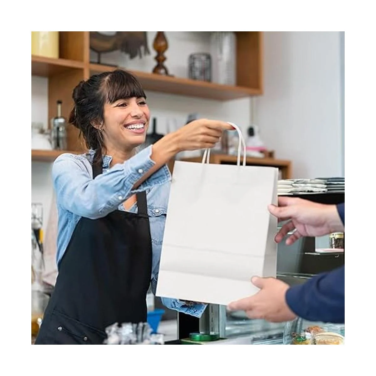 Poever Bolsas de papel blancas con asas, 10 x 5 x 13 pulgadas, bolsas de regalo de papel kraft de 100 unidades, bolsas de compras grandes, bolsas de recuerdos de fiesta, bolsas de comestibles, bolsas de mercancía para productos de embalaje reciclables