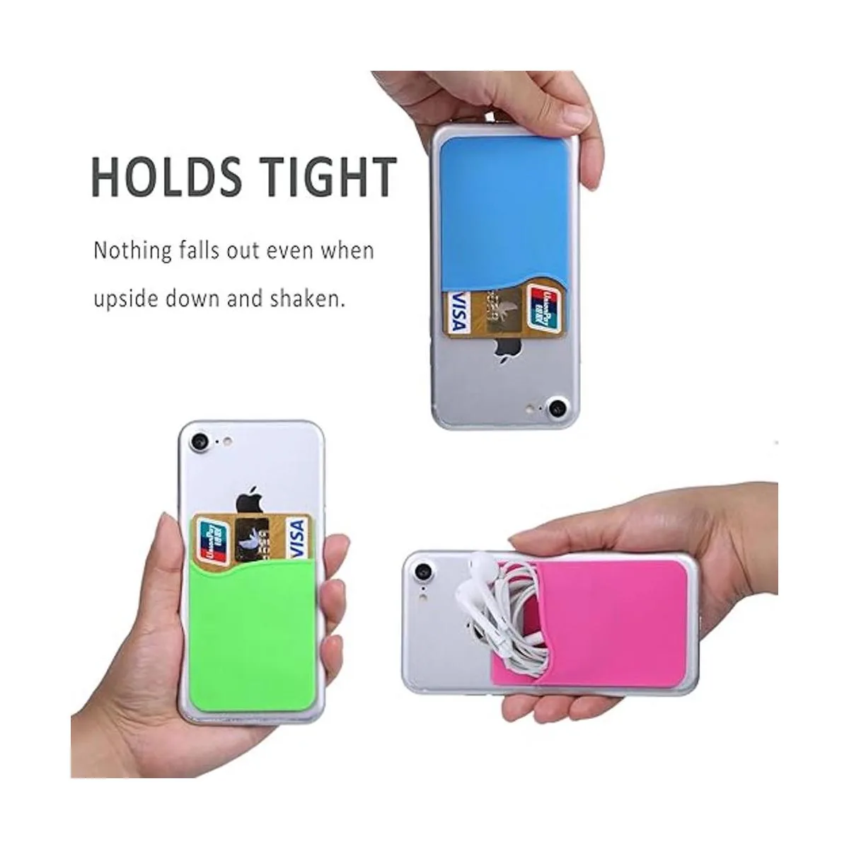Pofesun Paquete de 6 soportes para tarjetas de crédito, ultra delgados y adhesivos para tarjetas, cartera para tarjetas de crédito, funda para tarjetas de crédito, compatible con iPhone, Android, la mayoría de teléfonos inteligentes. negro, blanco, gris, azul, rosa, verde