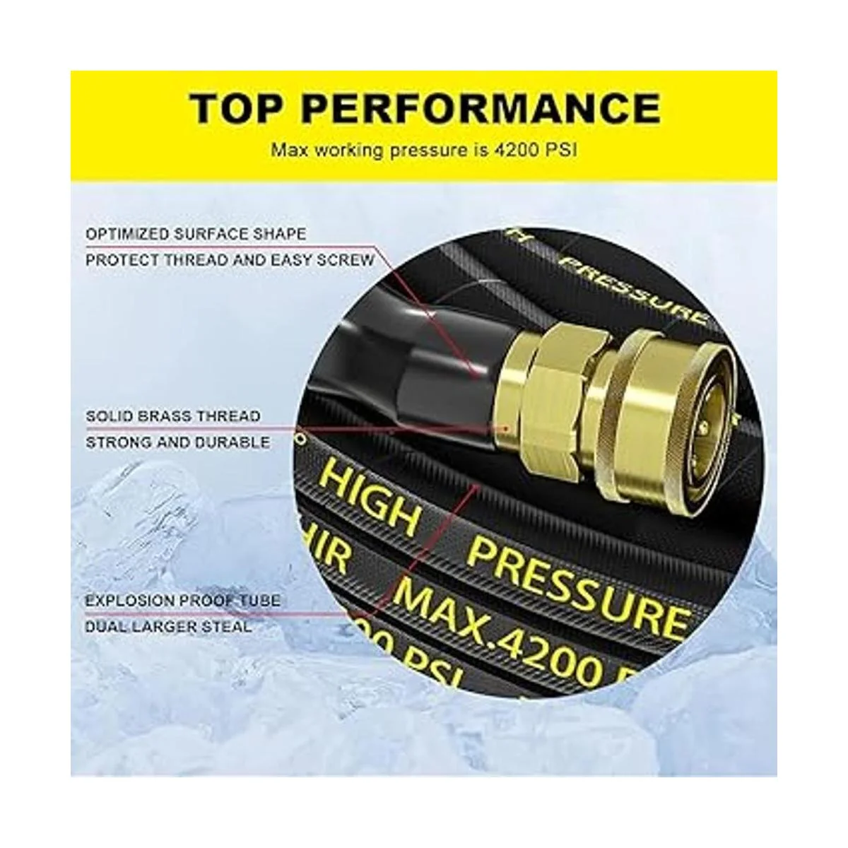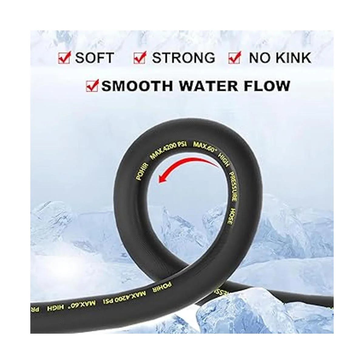 Manguera de lavado de alta presión: la presión máxima de trabajo de esta manguera de látigo es de hasta 4200 PSI. La presión de ráfaga alcanza 16000 PSI. La temperatura máxima de trabajo es de 140.0 F. El caudal es de 2.5 GPM a 5 GPM.